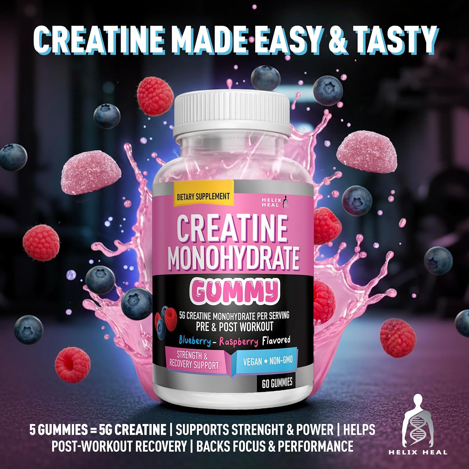 Delivers 5g creatine monohydrate in scoop-free gummies—no mixing or grit. Easy to take pre or post workout, supporting consistent creatine intake without mess or powder fatigue. Ideal for lifters, athletes, and daily performance routines