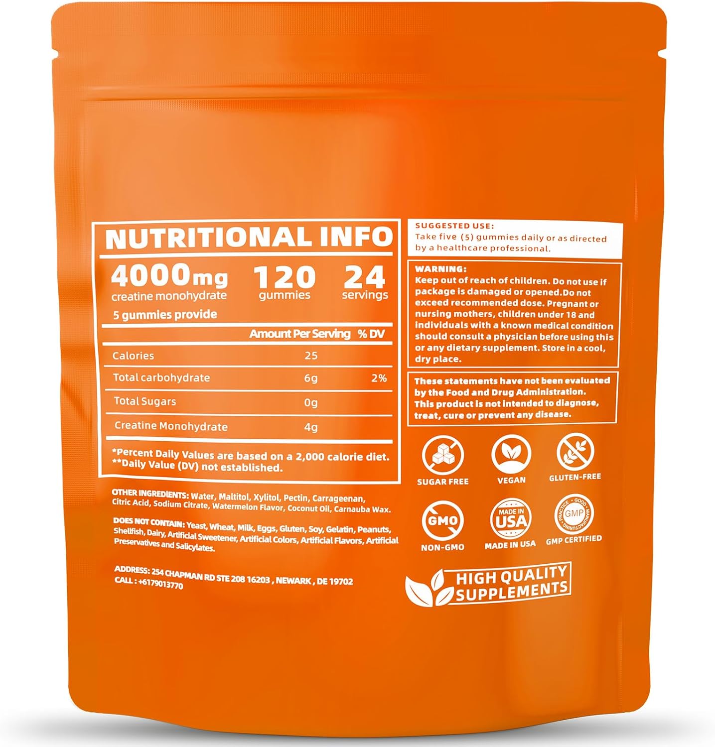 Convenient & Delicious: Perfect for on-the-go, these gummies fit easily into your gym bag or pocket. With 4g of creatine per serving and a natural orange flavor, they provide a tasty alternative to traditional creatine supplements, making your fitness routine both enjoyable and effective