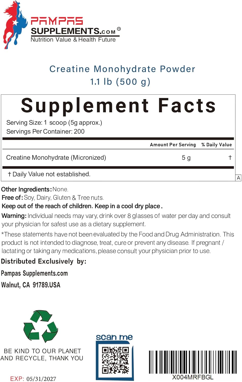 Pampas Supplements pure, unflavored creatine monohydrate powder. The perfect pre workout or post workout powder drink additive that is created with micronized ingredients for overall superior absorption. Effortlessly mix or combine with any of your favorite drinks and fitness supplements for the ultimate performance inside and outside the gym.