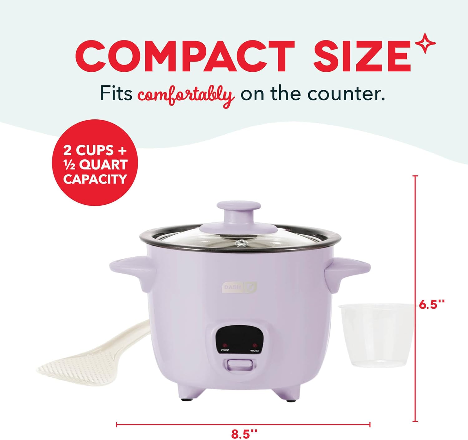 A small and mighty appliance, perfectly portioned for meals and meal preparation, the Dash Mini rice cooker is the one pot to cook it all and more. Featuring a keep warm function, you can keep your meal and ingredients hot for a longer time. Make 2 Cups of rice, grains, soups, stews, and more with this easy-to-use appliance featuring PFOA-free nonstick coating for easy cleaning. Dishwasher safe and durable, this compact cooker is perfect for dorms, to apartments, to offices. Includes a recipe guide with 14 delicious meals and sides.