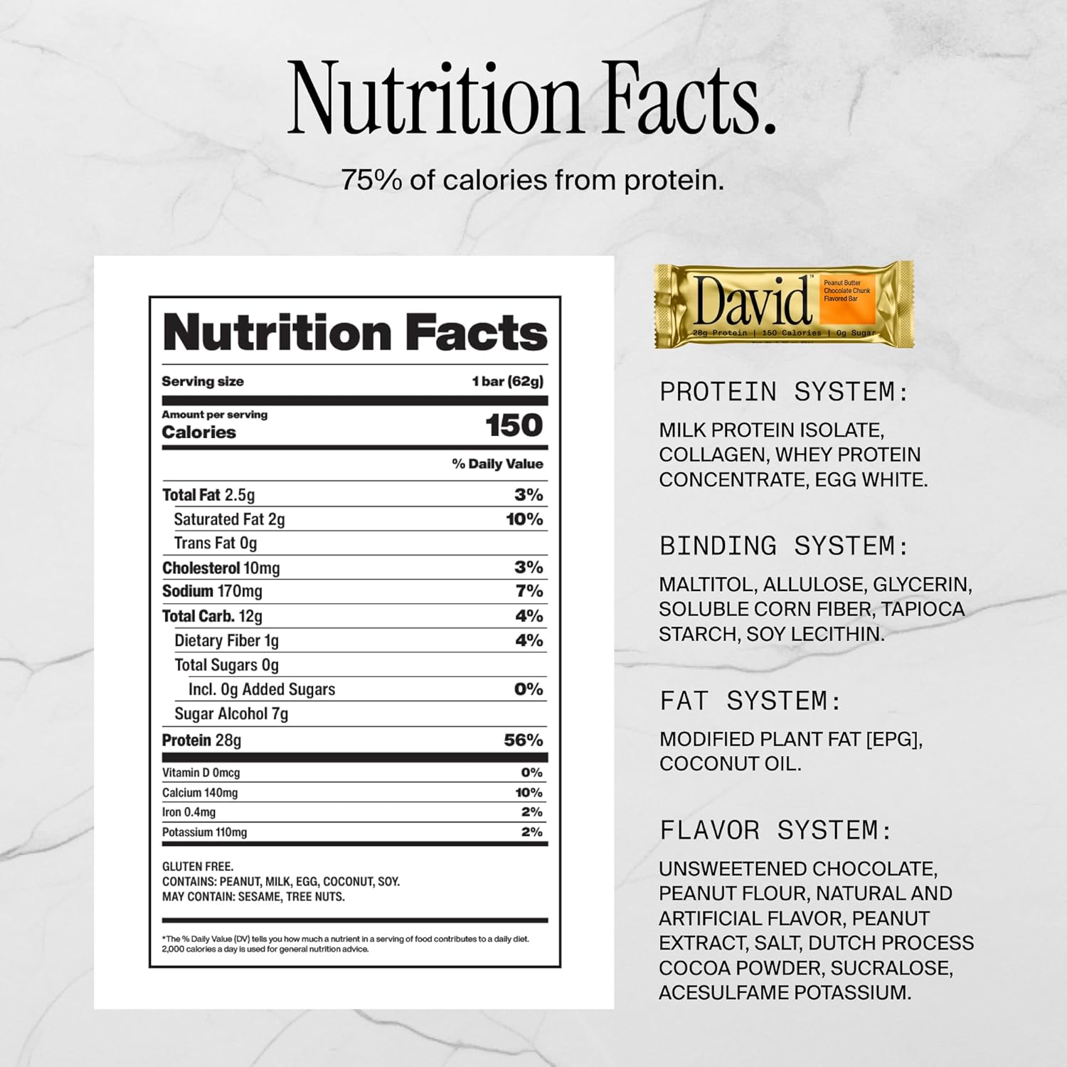 DELICIOUS FLAVOR OPTIONS – Peanut Butter Chocolate Chunk David protein bar is sweet, salty, & creamy, filled with rich chocolate chunks and roasted peanut crisps.With the David Flavor System, you get all the sweetness without added sugar. These low carb protein bars have a creamy texture with added crunchy crisps. Key components of the flavor system are cocoa powder, natural & artificial flavors, salt, sucralose, & acesulfame potassium.