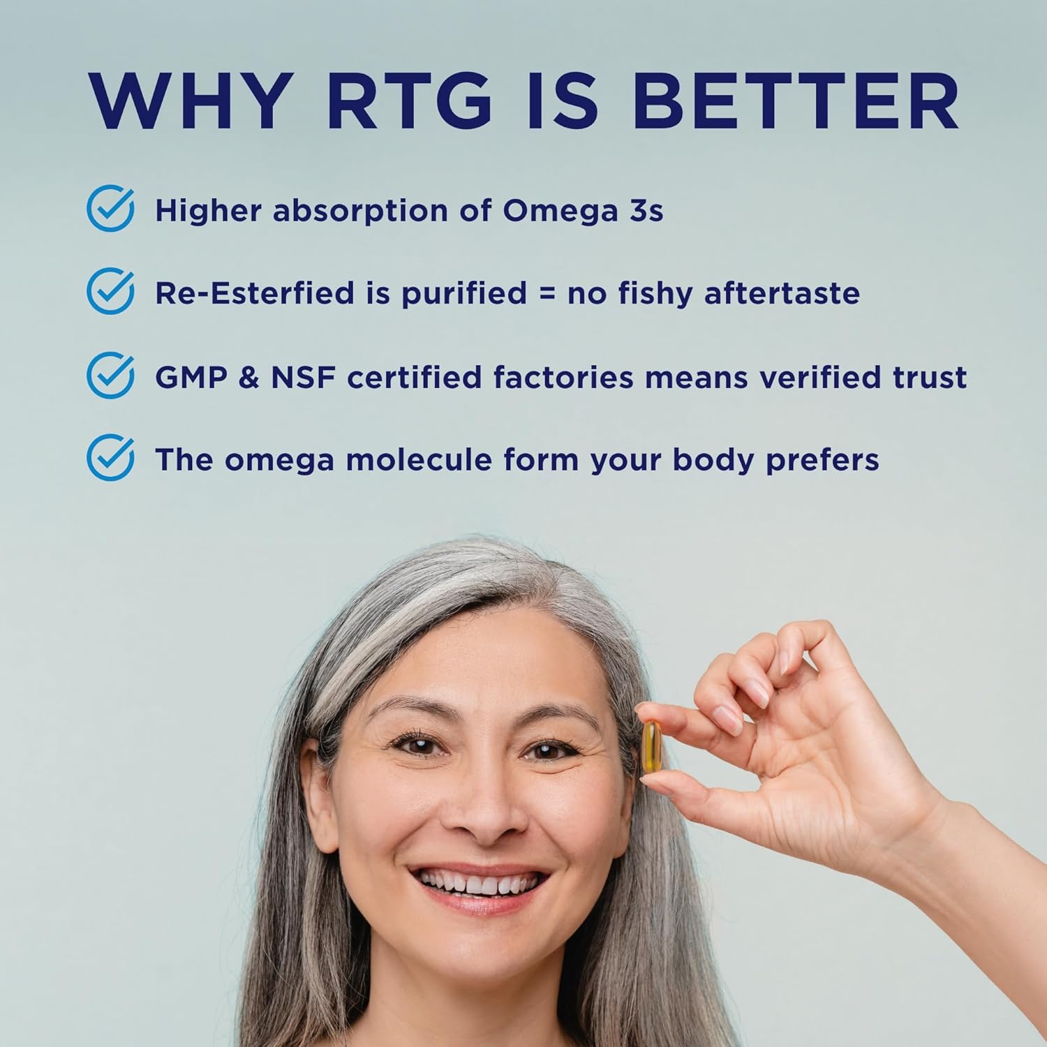 Omega 3 triglyceride form: Unlike other fish oil supplements, our softgels are made with re-esterified triglyceride (rTG) omega-3, which is absorbed 3x faster by the body and eliminates any fishy aftertaste