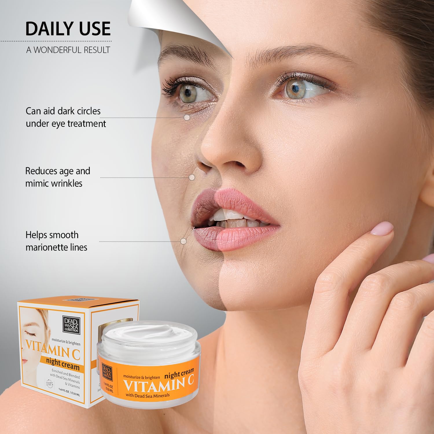 Face cream with Vitamin C – revitalizing night cream enriched with pure Dead Sea minerals, Vitamins A & E, and a nourishing formula, designed to support skin hydration and smoothness. This firming face cream helps improve skin texture, reducing the appearance of fine lines and uneven tone. Vitamin C enhances skin vitality, leaving it looking refreshed, healthy, and well-nourished.
