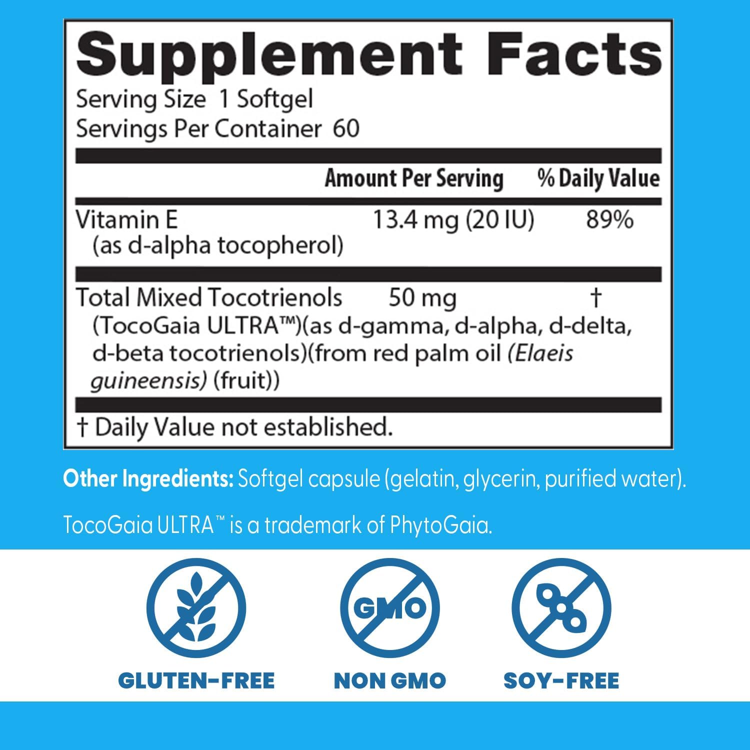 CONTAINS TOCOGAIA ULTRA bio enhanced full spectrum vitamin E complex;Made from sustainably produced palm oil;It elevates tocotrienols in the blood, brain, heart, liver, and skin while conserving Alpha-Tocopherol Levels