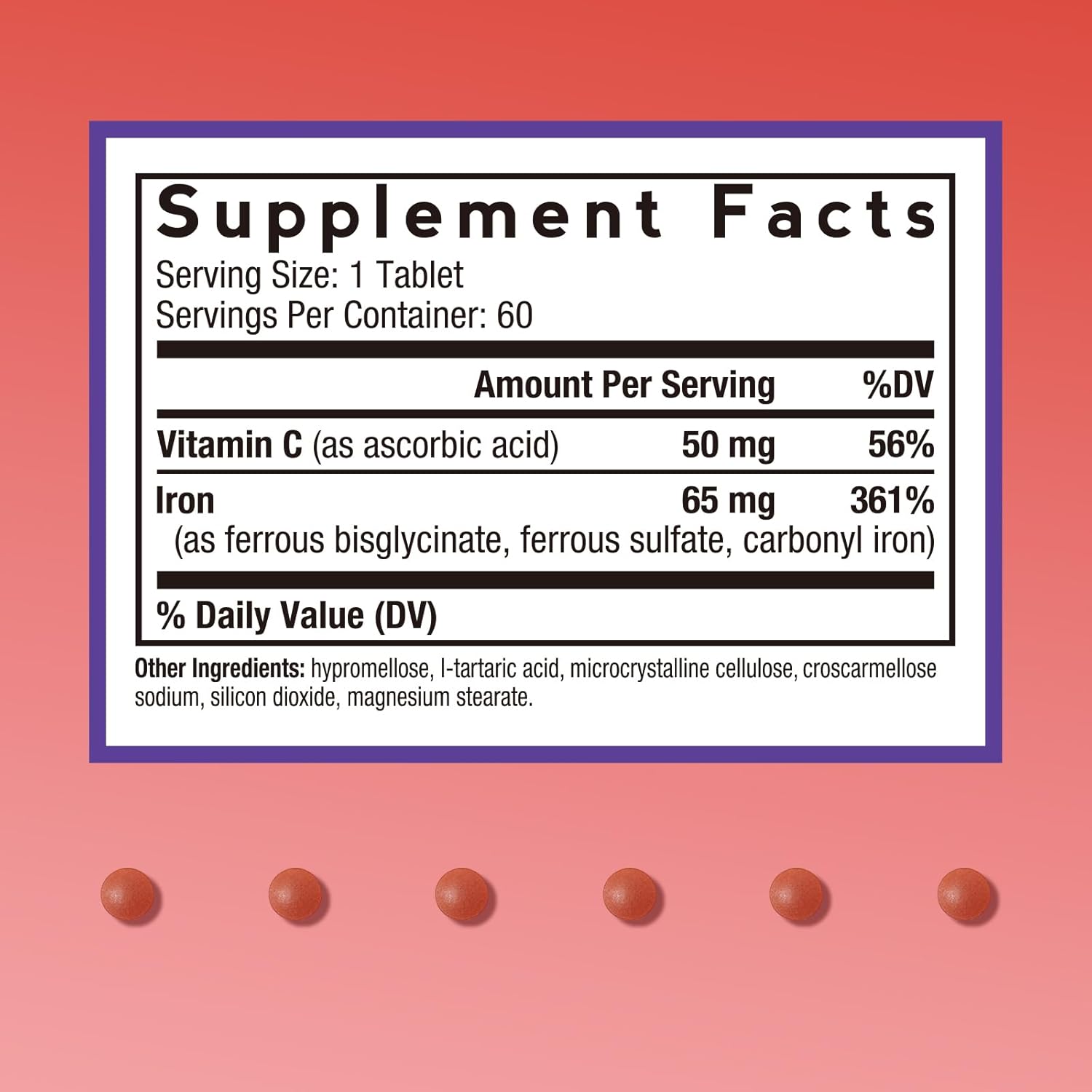 Triple-Action Iron Support: This powerful iron supplement features three superior forms of iron – highly bioavailable Ferrous Bisglycinate Chelate, gentle Carbonyl Iron and widely used Ferrous Sulfate – all in one tablet. Delivers 65mg of high-potency elemental iron without the usual side effects like stomach upset or constipation.*