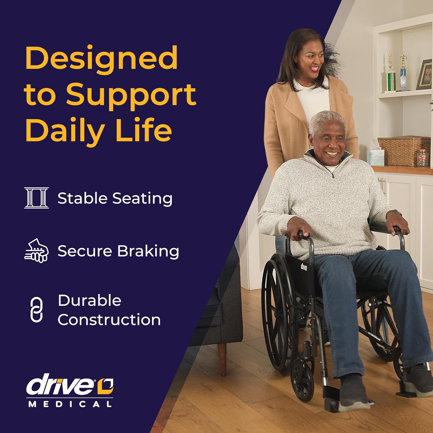 The Drive Medical Silver Sport 1 Folding Transport Wheelchair is designed to provide dependable, comfortable mobility support for adults and seniors who need assistance during travel, appointments, or daily outings. Built with a durable powder-coated silver vein steel frame, this transport chair balances long-lasting strength with user-friendly portability. Weighing just 37.6 lb, it is easy for caregivers to maneuver, fold, and lift into a vehicle, making it a practical option for both short-term recovery and ongoing mobility needs. Comfort is a core feature of the Silver Sport 1. The chair includes full-length padded armrests that offer steady support and reduce pressure on the arms during extended use. Its nylon upholstery is not only supportive and breathable but also simple to maintain and clean. The removable swing-away footrests allow users to position their legs comfortably and enable easy transfers in and out of the chair. When folded, the chair becomes compact, helping save space in storage and ensuring transport remains quick and convenient. With a weight capacity of 250 lb and optimized dimensions that balance comfort and portability, the Silver Sport 1 Transport Wheelchair is an excellent choice for individuals seeking a reliable, easy-to-use mobility solution. Since 2000, Drive Medical has proudly manufactured trusted medical equipment and homecare products that are used in homes and hospitals across the globe. We offer a wide range of products to support your family’s needs, from mobility to bath safety, from patient care to personal care. Our mission is simple: to enhance the lives of our customers with products that support safety, independence, and comfort. When you shop from Drive Medical, you’ll find unmatched quality, cutting-edge innovation, and products designed in partnership with clinical experts.