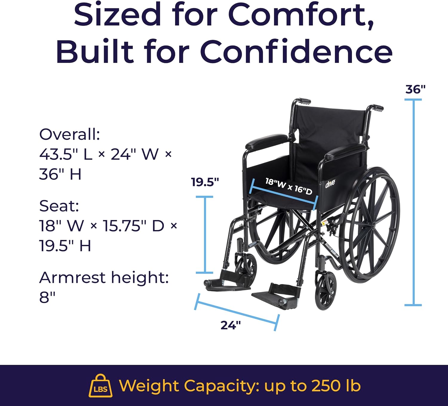 The Drive Medical Silver Sport 1 Folding Transport Wheelchair is designed to provide dependable, comfortable mobility support for adults and seniors who need assistance during travel, appointments, or daily outings. Built with a durable powder-coated silver vein steel frame, this transport chair balances long-lasting strength with user-friendly portability. Weighing just 37.6 lb, it is easy for caregivers to maneuver, fold, and lift into a vehicle, making it a practical option for both short-term recovery and ongoing mobility needs. Comfort is a core feature of the Silver Sport 1. The chair includes full-length padded armrests that offer steady support and reduce pressure on the arms during extended use. Its nylon upholstery is not only supportive and breathable but also simple to maintain and clean. The removable swing-away footrests allow users to position their legs comfortably and enable easy transfers in and out of the chair. When folded, the chair becomes compact, helping save space in storage and ensuring transport remains quick and convenient. With a weight capacity of 250 lb and optimized dimensions that balance comfort and portability, the Silver Sport 1 Transport Wheelchair is an excellent choice for individuals seeking a reliable, easy-to-use mobility solution. Since 2000, Drive Medical has proudly manufactured trusted medical equipment and homecare products that are used in homes and hospitals across the globe. We offer a wide range of products to support your family’s needs, from mobility to bath safety, from patient care to personal care. Our mission is simple: to enhance the lives of our customers with products that support safety, independence, and comfort. When you shop from Drive Medical, you’ll find unmatched quality, cutting-edge innovation, and products designed in partnership with clinical experts.