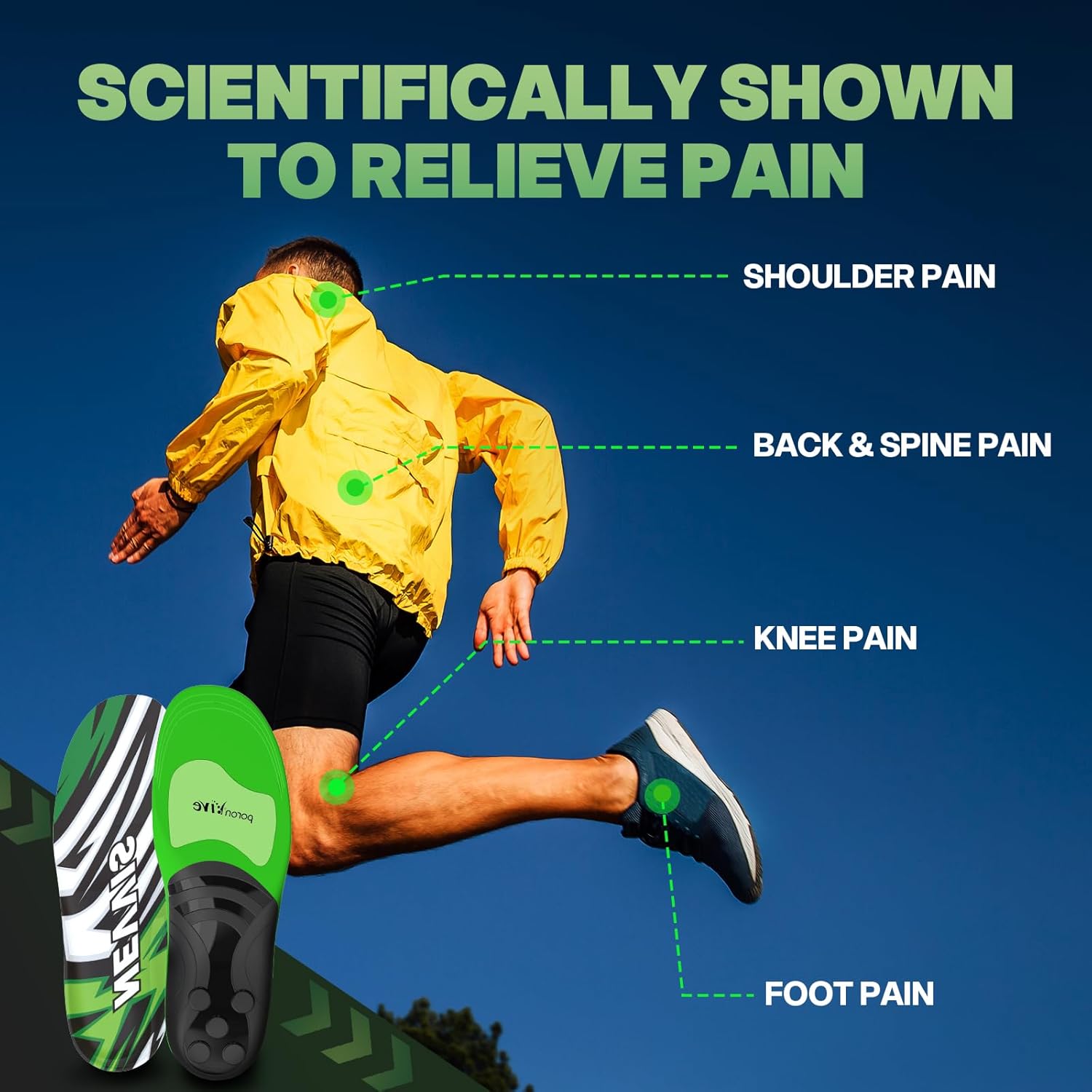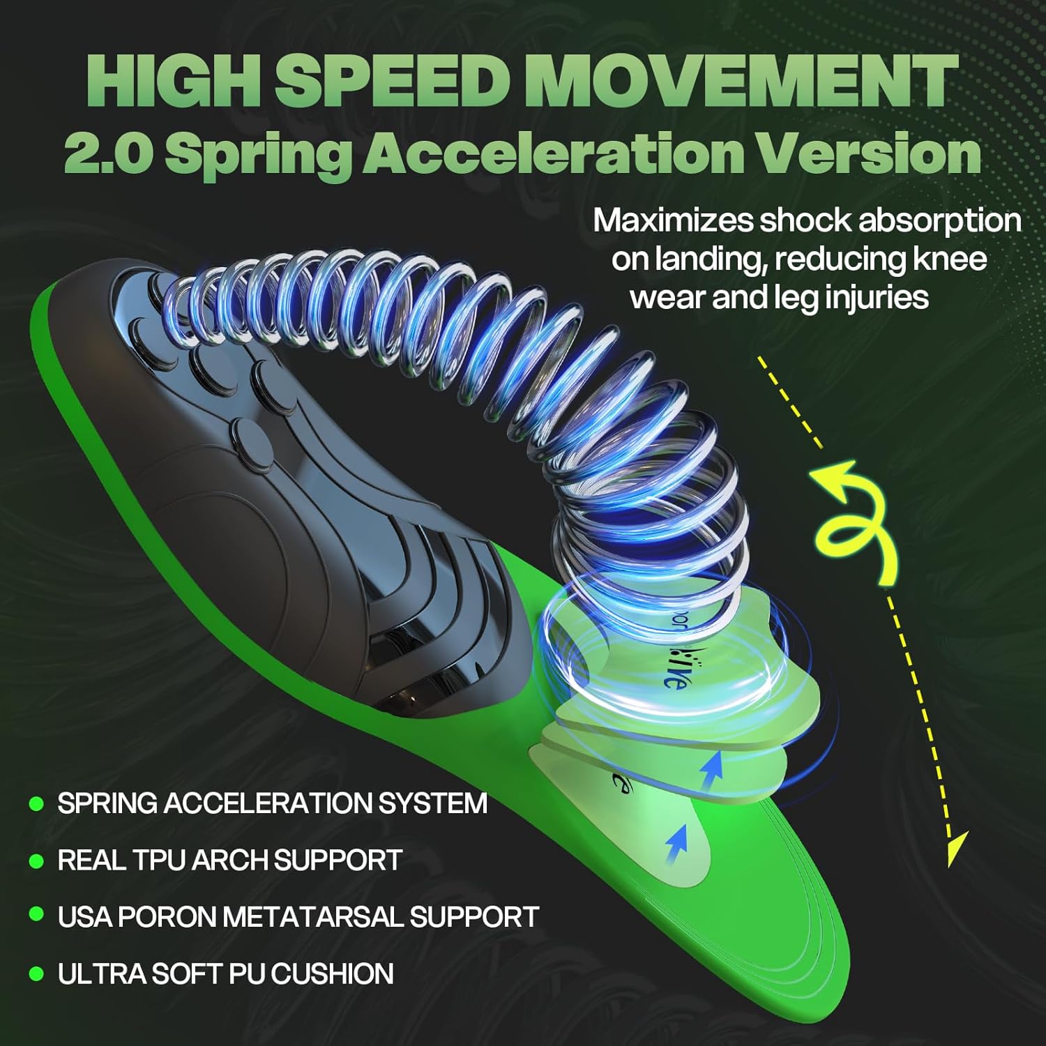 Triple-Layer Impact Defense: a PU base cushions your arch for plantar fasciitis relief, Premium PORON material in the forefoot pad shields the balls of your feet, and a rigid TPU heel cup locks the springs in place—lasting twice as long as foam or gel insoles