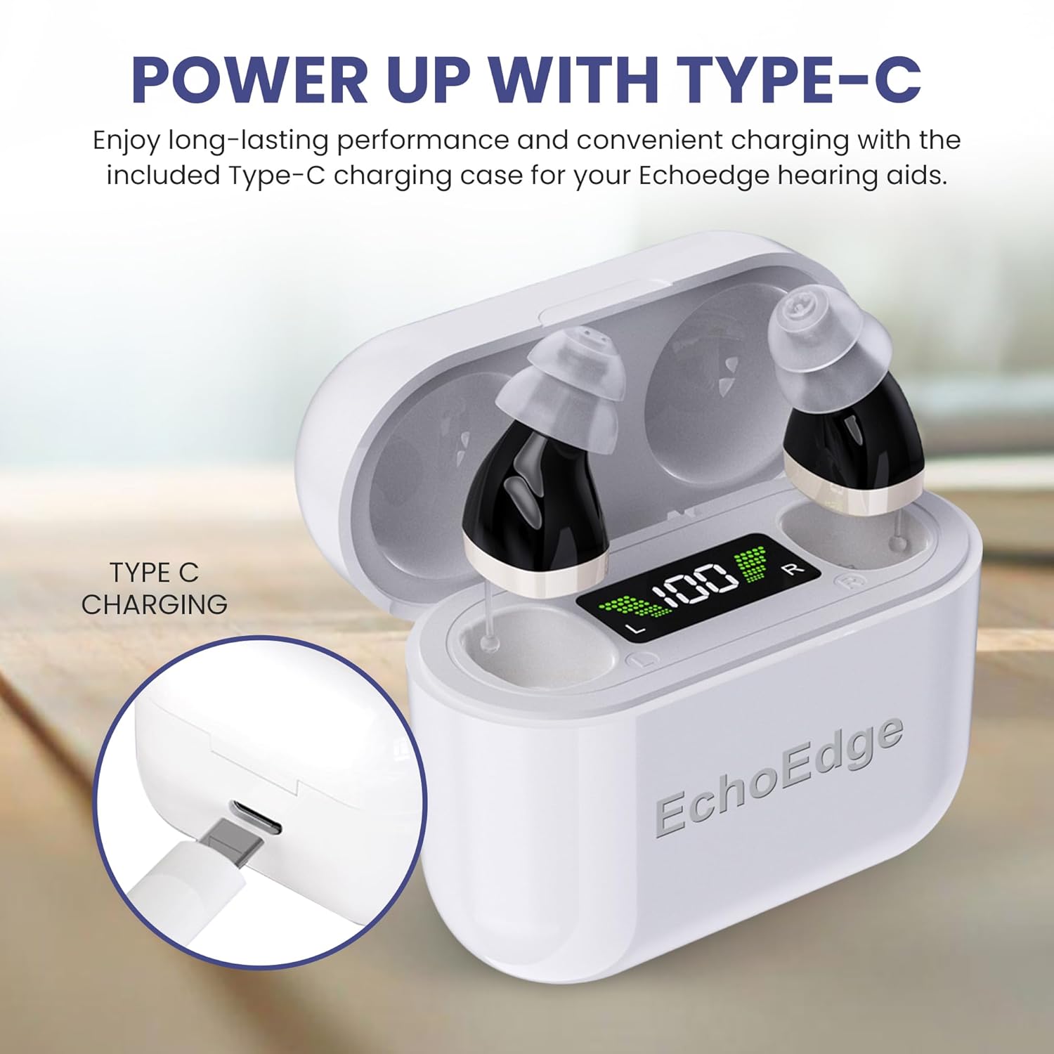 Long-lasting Performance: Experience uninterrupted use with the Echoedge Rechargeable Hearing Aids, offering up to 30 hours of usage on a single charge. The included charging case provides an additional two recharges, ensuring extended listening time without interruptions.