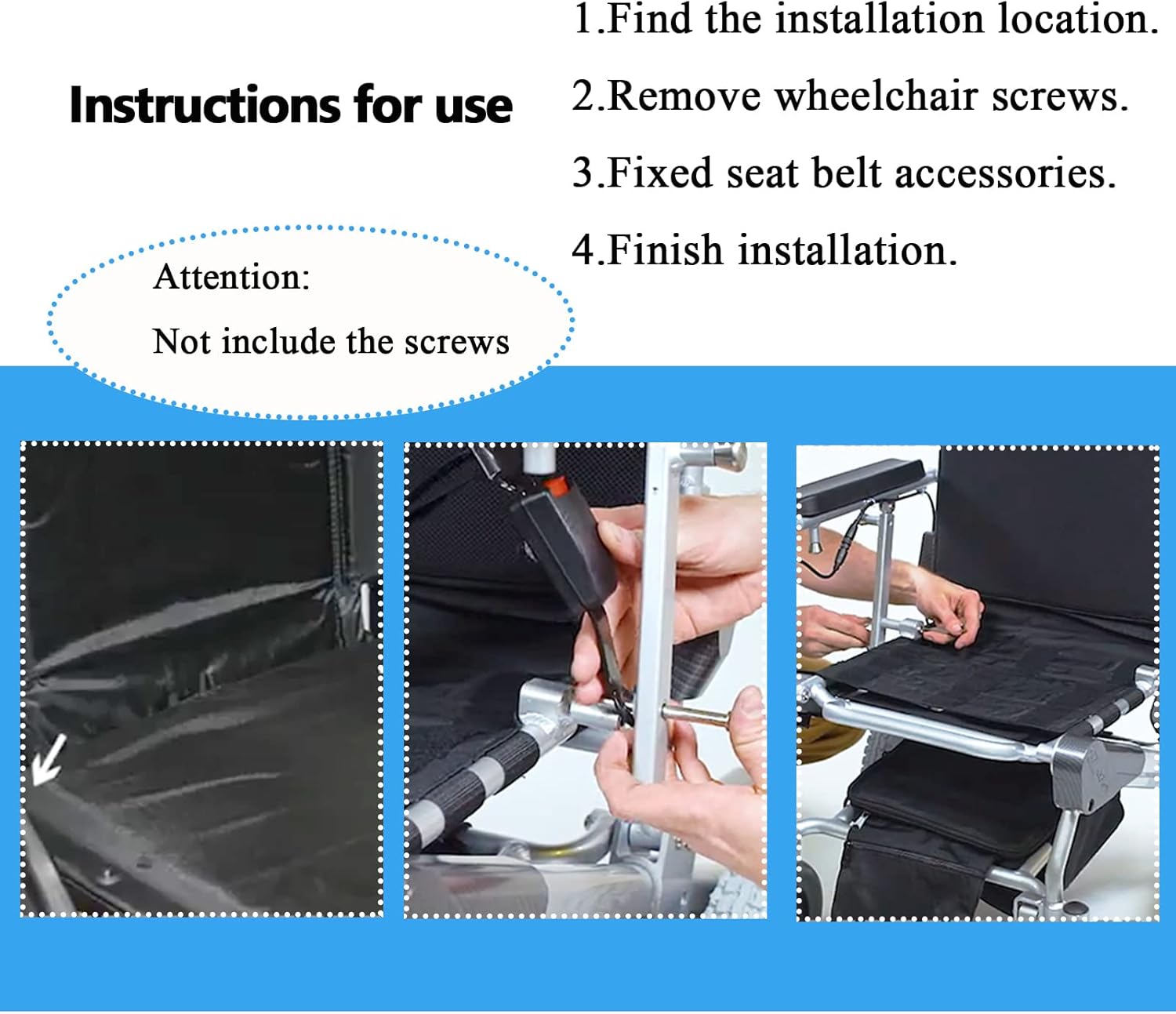 How to use: No need to drill holes, use grommets to inastall. Remove bottom screws from left and right side of the wheelchair backrest, then insert screws through grommets on the belt.
