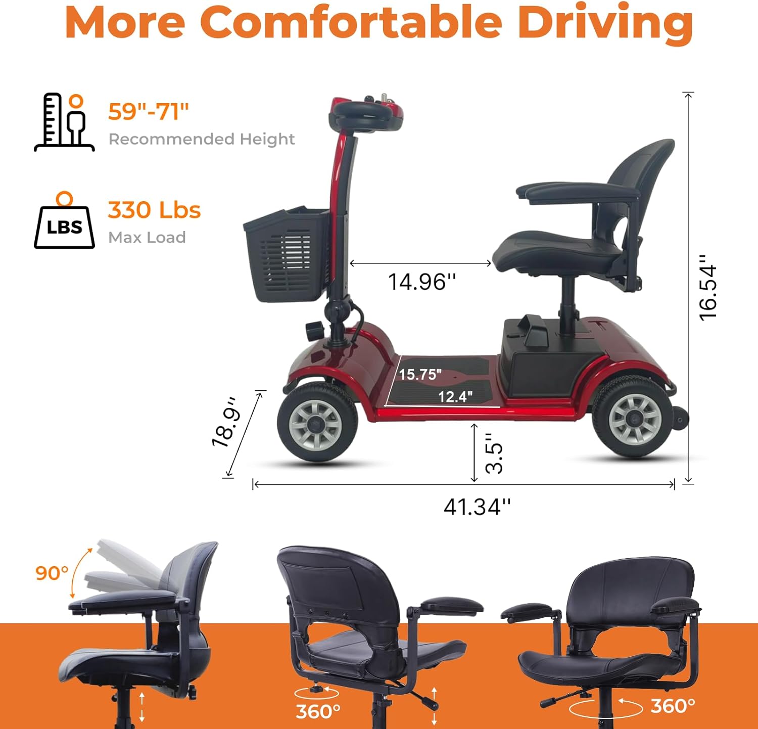 Compact design: Equipped with a 24V 12Ah battery, the standard range per charge can reach up to 12.4 miles. It can bear a weight of up to 330 pounds, which is superior to other products. The maximum speed can reach 4.97 miles per hour. Convenient for travel. Adjustable seats offer a comfortable riding experience