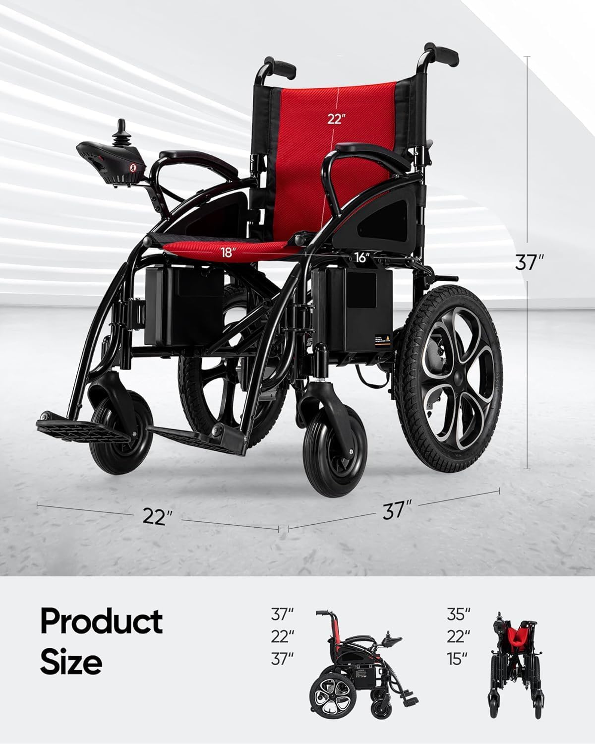 Conquer All Terrains: Designed with 16-inch all-terrain wheels, this motorized wheelchair provides excellent grip and stability on any surface. With two powerful motors, it effortlessly climbs steep inclines (up to 9°) and can cover up to 15 miles on a single charge, making it perfect for both short trips and long adventures.
