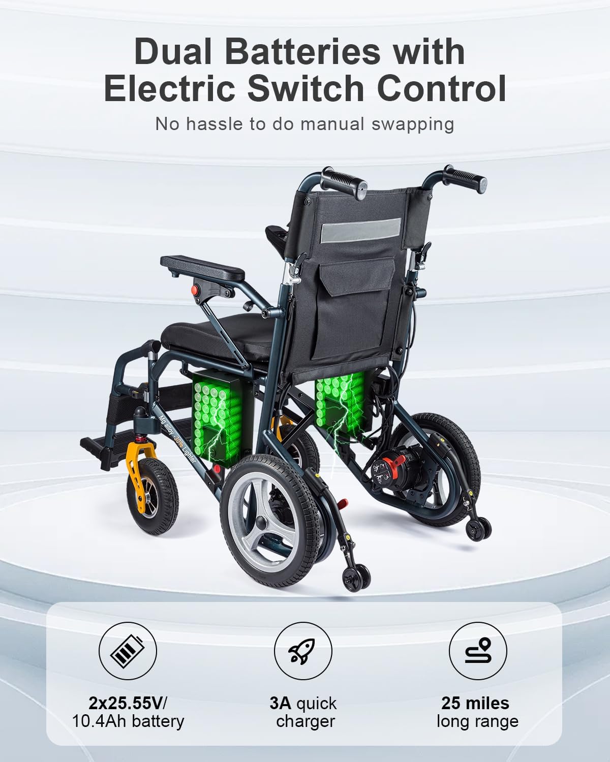 【Extended Range & Rapid Dual-Battery Charging】Dual 10.4Ah batteries unlock 25 miles of real-world freedom – the ultimate electric wheelchairs solution for all-day adventures.Skip battery shuffling: Instantly switch power sources via side-mounted buttons, the fast charger refuels a battery in just 3-4 hours, say goodbye to range anxiety.