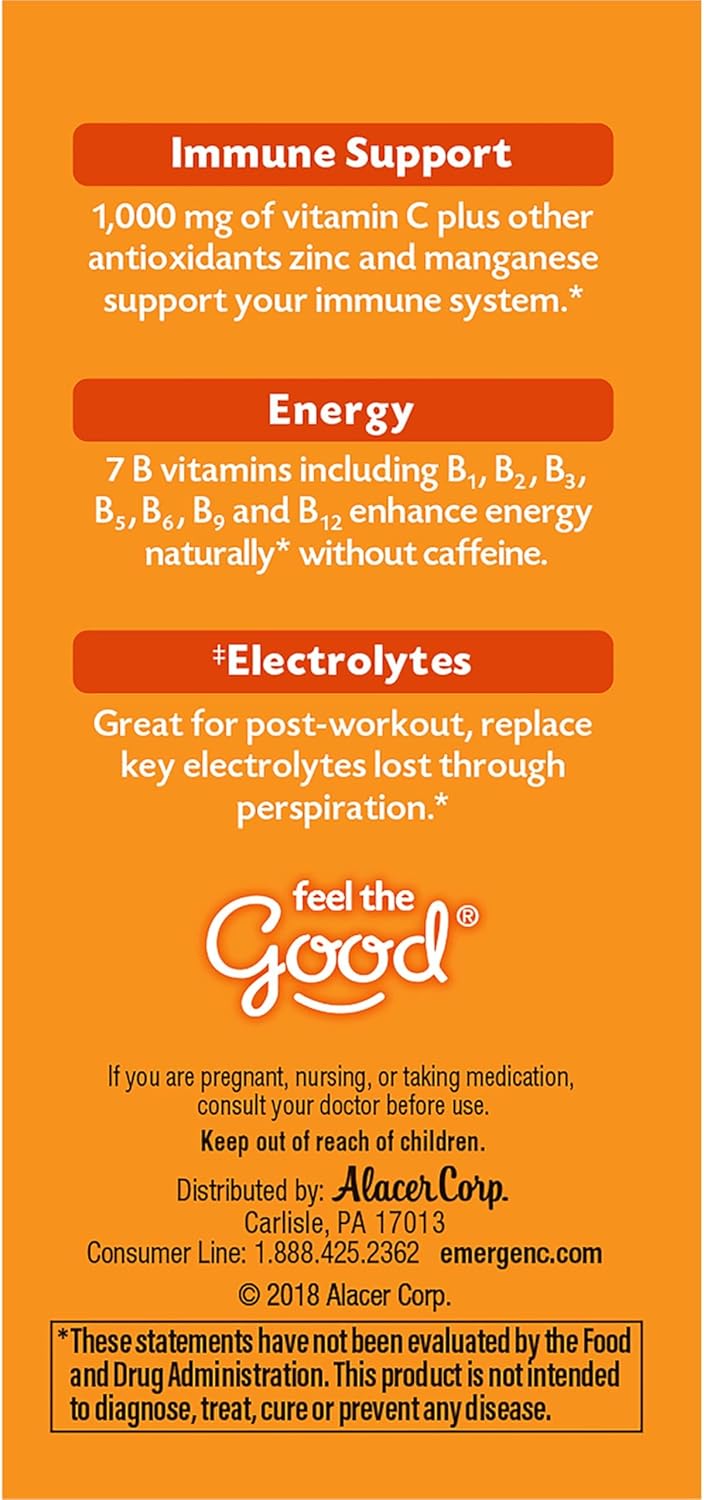 Emergen-C 1000mg Vitamin C Powder dietary supplement helps you achieve your wellness goals with a fizzy dietary supplement for daily immune support (1). Each vitamin mix serving contains more vitamin C than 10 oranges (2), plus other antioxidants zinc and manganese for immune support (1). These dietary supplements also come with B vitamins for energy support and electrolytes to help replace those lost through perspiration (1). They come in convenient packets that provide a delicious choice as a post-workout drink to replace key electrolytes lost through perspiration (1) with natural fruit flavor and natural sweeteners. Emergen-C Super Orange flavored powdered vitamin mix is easy to dissolve. Mix one packet with 4 to 6 ounces of water. Transform every day with vitamin C supplements from Emergen-C. (1) This statement has not been evaluated by the Food and Drug Administration. This product is not intended to diagnose, treat, cure, or prevent any disease. (2) Based on using the USDA nutrient database value for a large, raw orange.