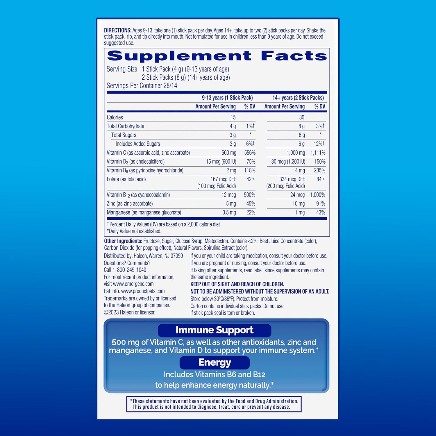 Emergen-C Immune Plus Crystals are your on-the-go solution to fortified immune support!(1) Enhanced immune support formula with vitamin D for when you feel you need extra immune support.(1) Packed with essential nutrients and deliciously crafted in a Berry Lemonade flavor, these convenient stick packs bring you the ultimate immune supporting experience. Immune Support with 500mg of Vitamin C as well as other antioxidants, zinc, and manganese, and Vitamin D to support your immune system.(1) But that’s not all- we’ve infused vitamins B6 and B12 to help enhance energy naturally.(1) It’s a comprehensive blend that caters to your immune and energy needs in one easy-to-carry pack. Forget the hassle of water – our crystals are designed for an instant rip-and-pour action directly into your mouth. No mixing, no fuss, just the refreshing burst of Berry Lemonade goodness. Designed to fit seamlessly into your pocket, bag, or car, Emergen-C Immune Plus Crystals are your compact companions for those busy days. (1) These statements have not been evaluated by the Food and Drug Administration. These products are not intended to diagnose, treat, cure, or prevent any disease.