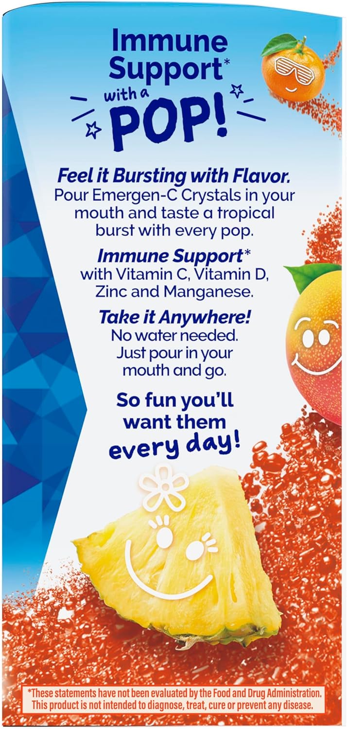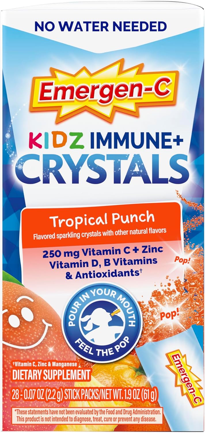Emergen-C Kidz Immune+ Crystals are your on-the-go solution to fortified immune support for kids! (1) Our immune support formula is enhanced with vitamin D for when you feel you need extra immune support. (1) Packed with essential nutrients and deliciously crafted in a Tropical Punch flavor, these convenient stick packs bring you the ultimate immune supporting experience. Immune Support with 250mg of Vitamin C as well as other antioxidants, zinc, and manganese, and Vitamin D to support your immune system. (1) They are infused with vitamins B6 and B12 to help enhance energy naturally. (1) It’s a comprehensive blend that caters to your immune and energy needs in one easy-to-carry pack. Forget the hassle of water – our crystals are designed for an instant rip-and-pour action directly into your mouth. Designed to fit seamlessly into your pocket, bag, or car, Emergen-C Kidz Immune+ Crystals are your compact companions for those busy days. Because a healthy immune system should be as easy as a rip, pour, and pop! (1) These statements have not been evaluated by the Food and Drug Administration. These products are not intended to diagnose, treat, cure, or prevent any disease.