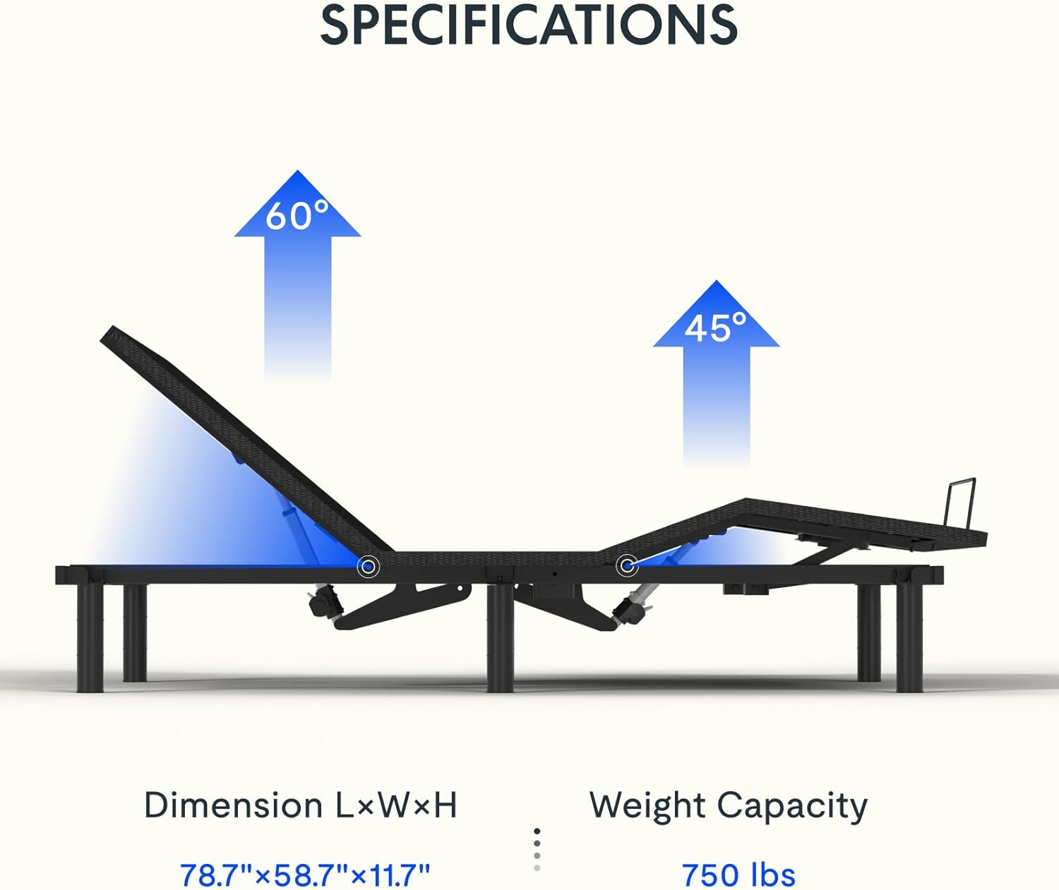 – DURABLE & STURDY: This adjustable bed base boasts a highly durable and sturdy design, with its motor tested to support up to 750 lbs, ensuring unmatched quality and longevity. Its six-legged structure and robust integrated steel frame provide exceptional stability, effectively preventing potential risk of tipping. Capable of accommodating a maximum weight capacity of 750 lbs, this bed frame delivers reliable and secure support.