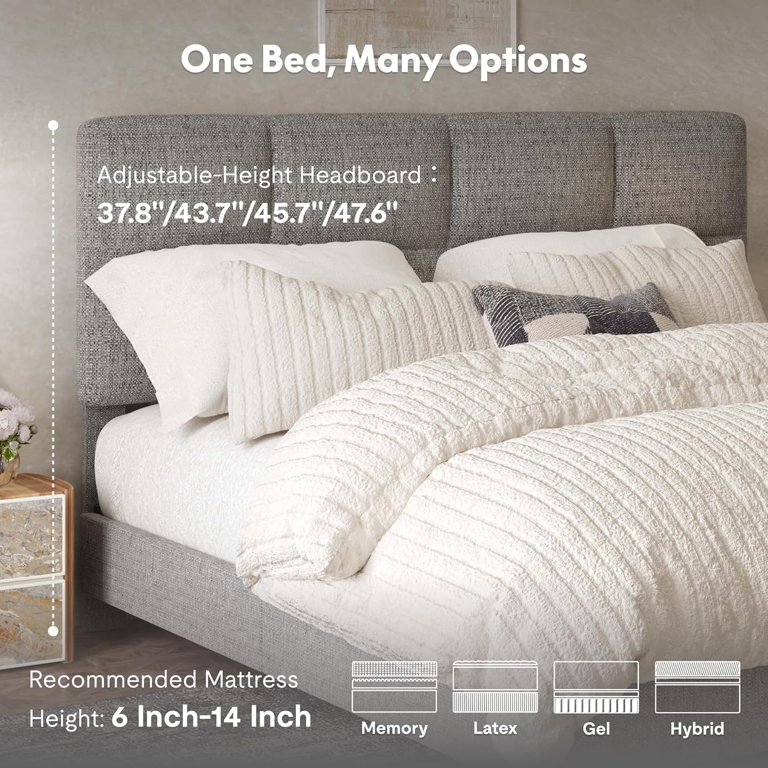 Easy Assembly & Ergonomic Comfort:Ships in clearly labeled boxes for straightforward setup; This adjustable bed frame helps improve circulation and reduce pressure for a more comfortable sleep.