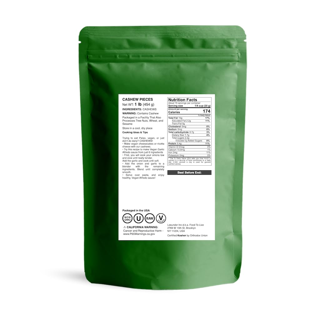 Cashew Pieces by Food to Live taste rich and sweet, which makes them a perfect addition to desserts. Crushed nuts are often sprinkled on sundaes or added to some other delicious confectionery masterpieces.