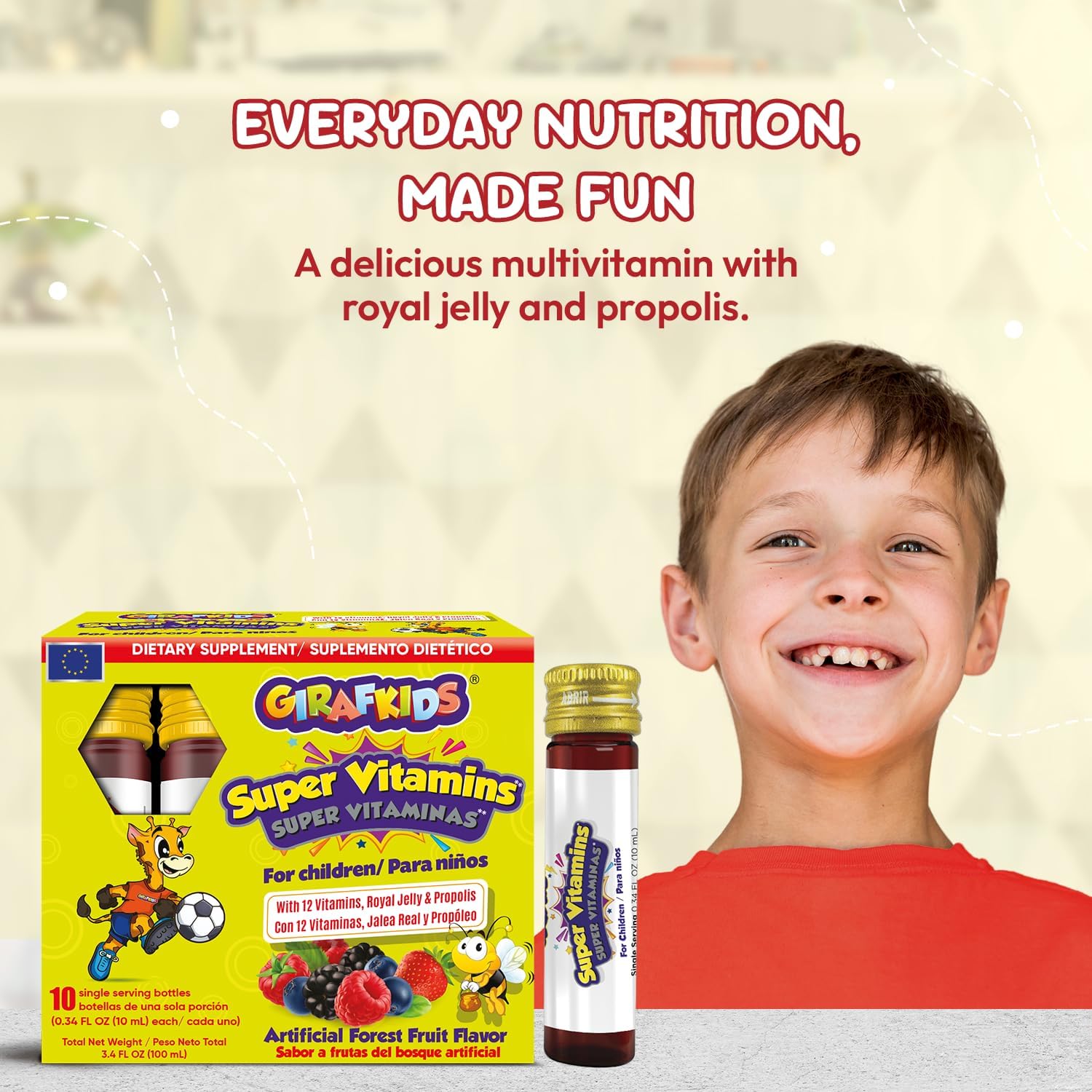 GirafKids Super Vitamins were thoughtfully created for parents who value balance, comfort, and simplicity in their child’s daily routine. Each box includes ten ready-to-drink vitamin vials, a clean liquid multivitamin for kids that blends taste and convenience in one. The forest fruit flavor makes every serving easy to enjoy, turning daily nutrition into a pleasant habit rather than a challenge. This wellness formula with vitamin C, B complex, D3, E, and folic acid offers a gentle way to complement everyday nutrition. Many parents find that adding liquid vitamins for kids helps make mornings smoother and more consistent, especially when picky eaters skip certain foods. The convenient single-dose format saves time, reduces spills, and fits naturally into lunchboxes or backpacks. Each vial contains a balanced mix of essential nutrients, including vitamin B12, vitamin A, and vitamin D3, combined with natural ingredients like royal jelly and propolis. Together, they form a thoughtful immune support supplement designed to fit the rhythm of family life, simple, practical, and enjoyable. At GirafKids, every detail matters. From ingredient selection to packaging, the focus is always on quality, safety, and ease of use. Parents can feel confident knowing their children are receiving a trusted, balanced multivitamin for kids crafted with care and attention. Whether at home or on the go, GirafKids Super Vitamins make it easy to keep wellness close at hand, a small daily gesture that supports kids’ natural vitality and growing energy through a balanced, clean approach to nutrition.