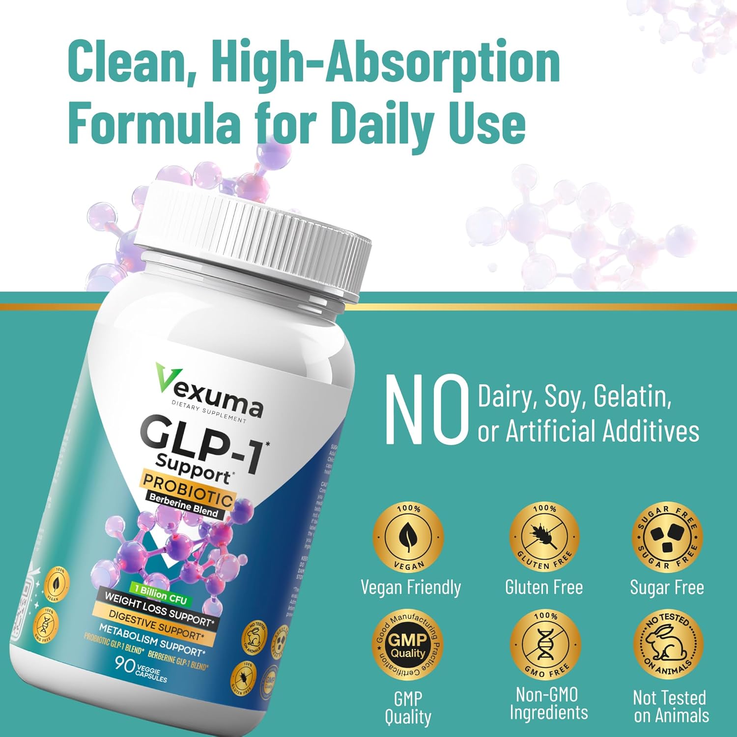 90 Capsules for Flexible Daily Use: Each bottle of Vexuma GLP1 Support Probiotic Berberine Blend includes 90 capsules, providing a 30-day supply when taken three times per day before meals. Designed to boost nutrient delivery and digestive timing, this formula complements structured daily routines and helps promote metabolic efficiency, sustained fat burn support, long-term energy balance, and full-body wellness through consistent use.