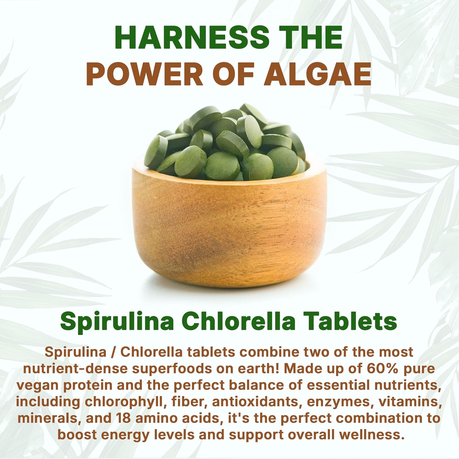 Nutrient Dense: Spirulina and Chlorella Capsules or Tablets are full of vital phytonutrients, including vitamins (A, B2, B12, C, E & more), amino acids & fatty acids (GLA, arginine, Omega 3, 6 & more) & essential minerals.