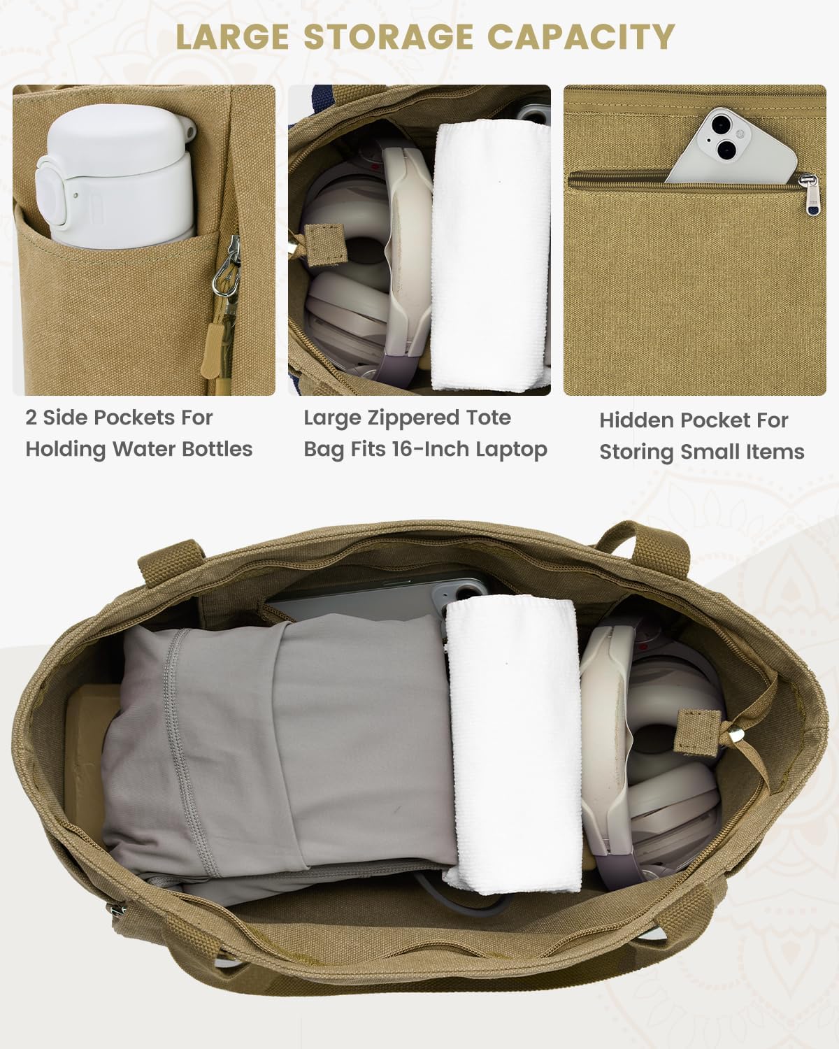 Large-Capacity Tote Bag with Multiple Pockets: top length 19.7″, bottom length 15.5″, width 5.5″, height 14.5″, spacious enough to accommodate yoga and other sports items. It features 2 side pockets for water bottles. Inside the yoga bag, there’s a small zipper pocket for storing small items like keys and phone