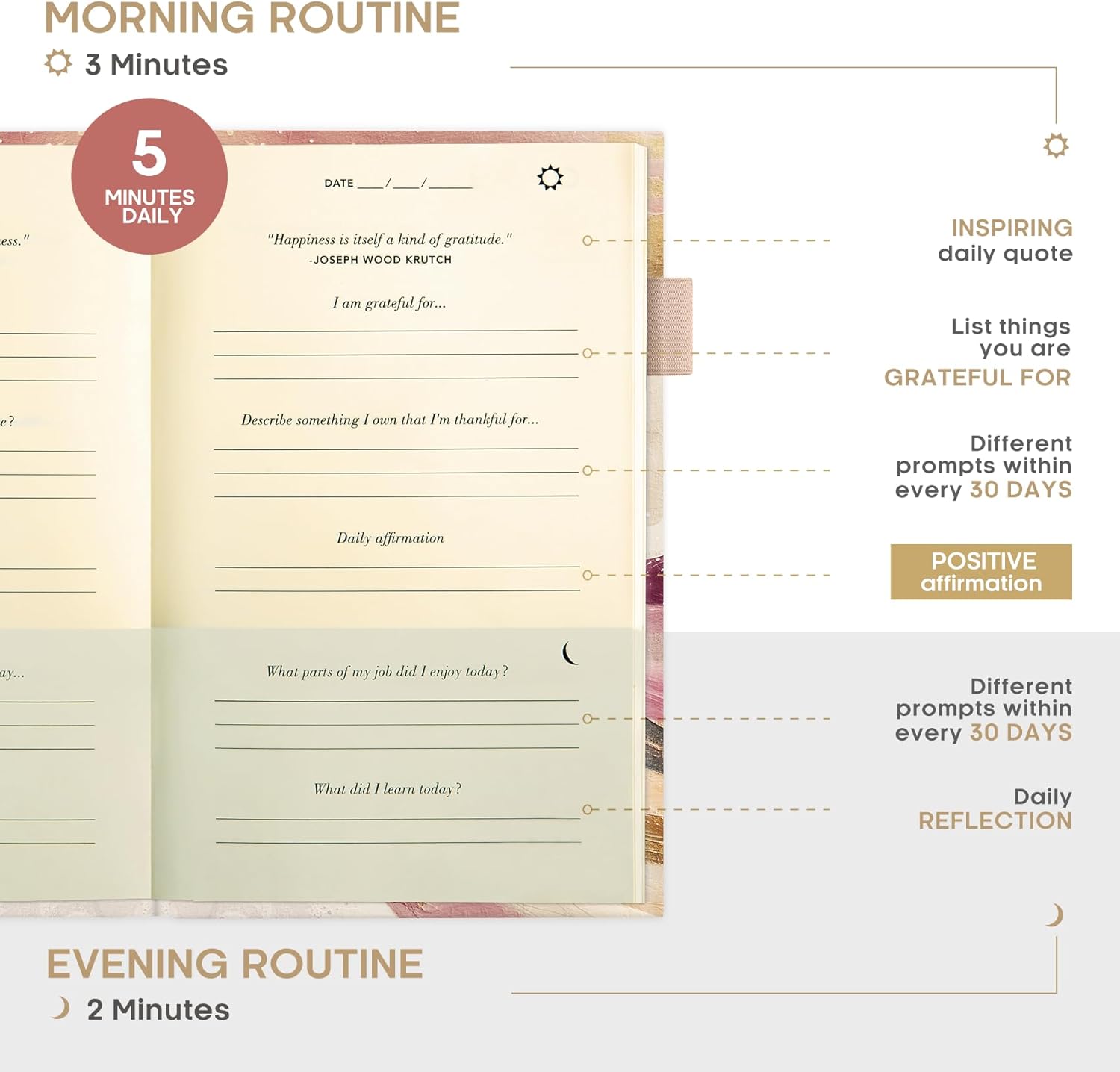 Cultivates Gratitude and Mindfulness- Start your day with appreciation and end it with deep reflection using our gratitude Journal. Every day features a morning and evening section, helping you to reflect on your day, set goals for yourself, and give thanks. Our gratitude journal will make a lasting difference in your life.