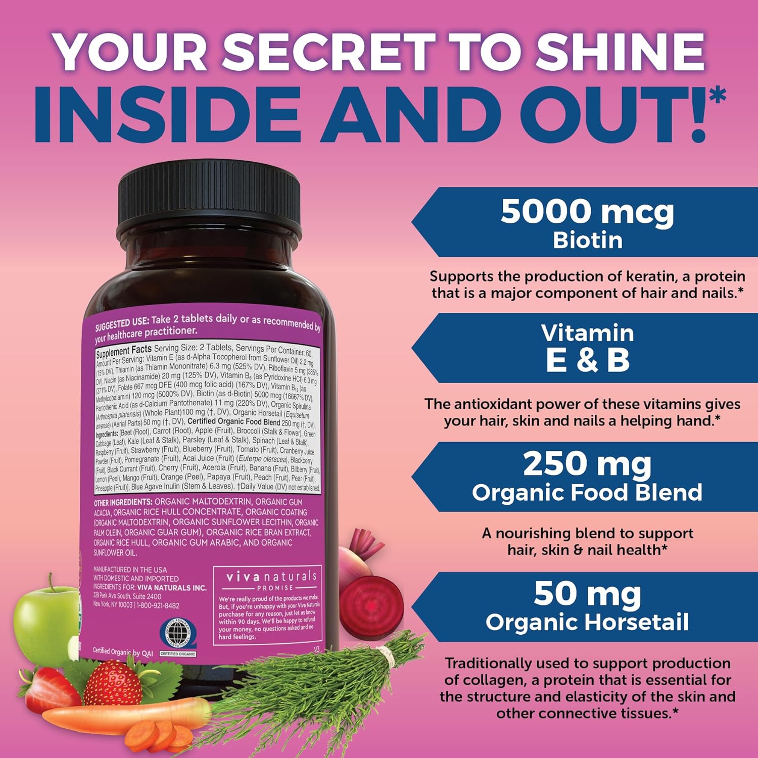 Beauty-loving ingredients* – Each serving of our Hair Skin and Nails Vitamins For Women provides Biotin 5000 mcg, Vitamin B12, Vitamin E, and Organic Horsetail, Organic Spirulina and a plant-based superfood blend to nourish from the inside out.*