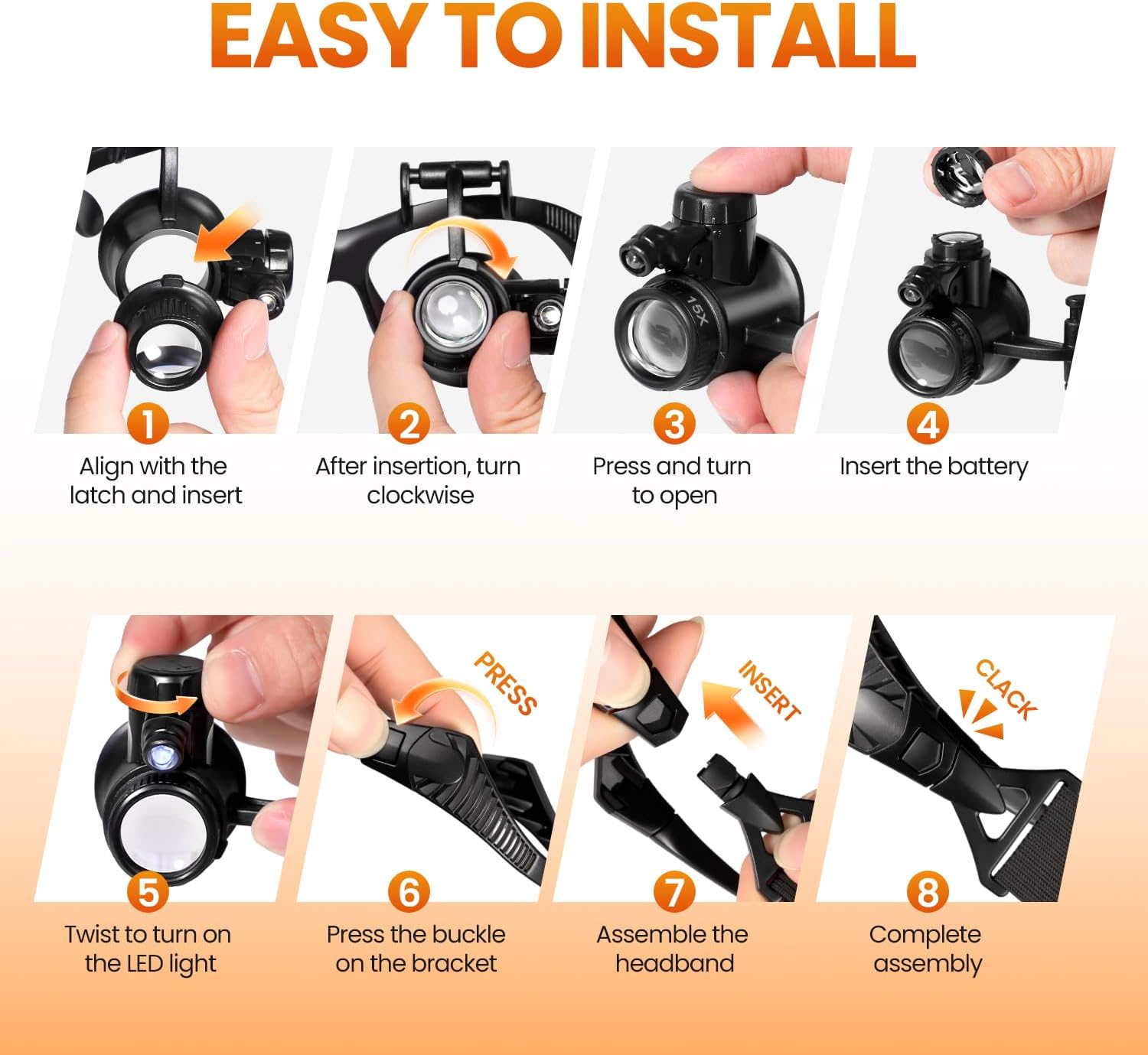 INTERCHANGEABLE LENS: There are 8 groups of interchangeable lenses in the package of our head-mounted magnifying glass: 2.5x / 4x / 6x / 8x / 10x / 15x / 20x / 25x, which can meet your needs for close work Kind of demand. It is recommended to choose a lens barrel with appropriate magnification according to the size of the object to be observed. The magnification can be quickly interchanged and placed in the corresponding lens storage box to keep it tidy.