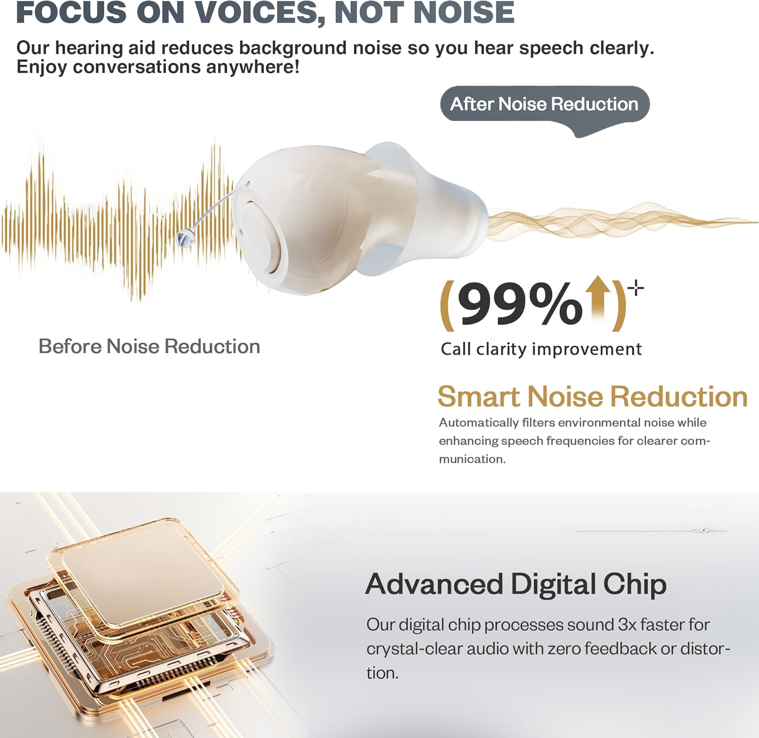 Invisible & All – Day Comfort: Ultra-compact, nearly invisible design sits discreetly in your ear. Soft, skin-friendly materials and ergonomic shape ensure all-day comfort, perfect for extended wear without irritation. No bulky look—just confident, comfortable hearing.
