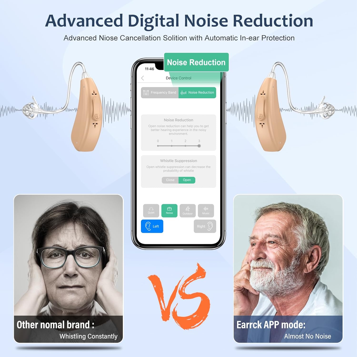[Bluetooth Hearing Aids with Smart APP Control]: Earrck Hearing Aids connect directly to smartphones via Bluetooth, enabling effortless sound adjustments, program changes, and frequency tuning (250Hz-8000Hz) through physical buttons or our intuitive app – ideal for seniors seeking simplified control. *To ensure full app functionality, please verify your phone runs Android 8.0+ or iOS 12.0+ before purchasing.