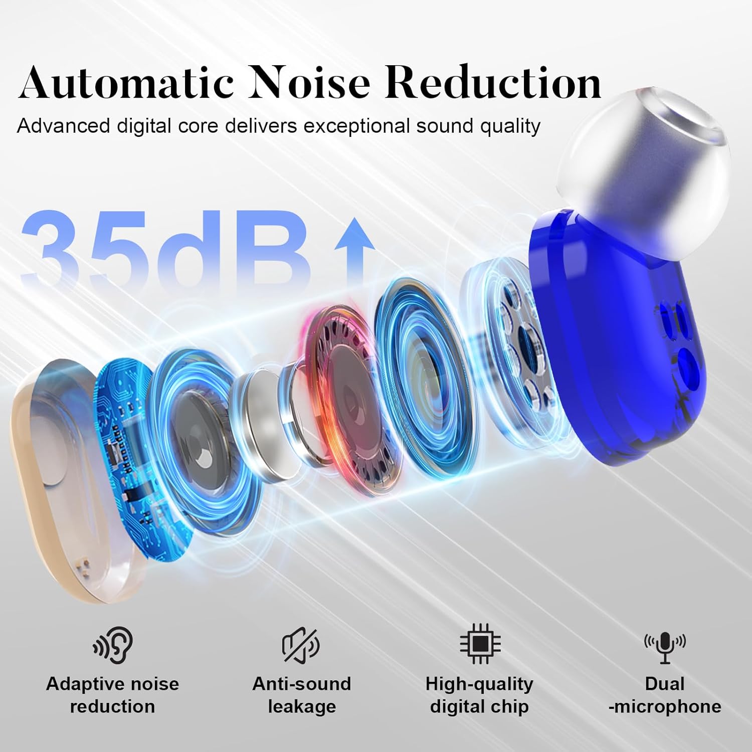 【Noise Reduction System】The hearing aid features an advanced active noise reduction system and multiple noise filters that optimize external sounds in real time, effectively eliminating background noise. This ensures clear, uninterrupted hearing during daily conversations or outdoor activities.