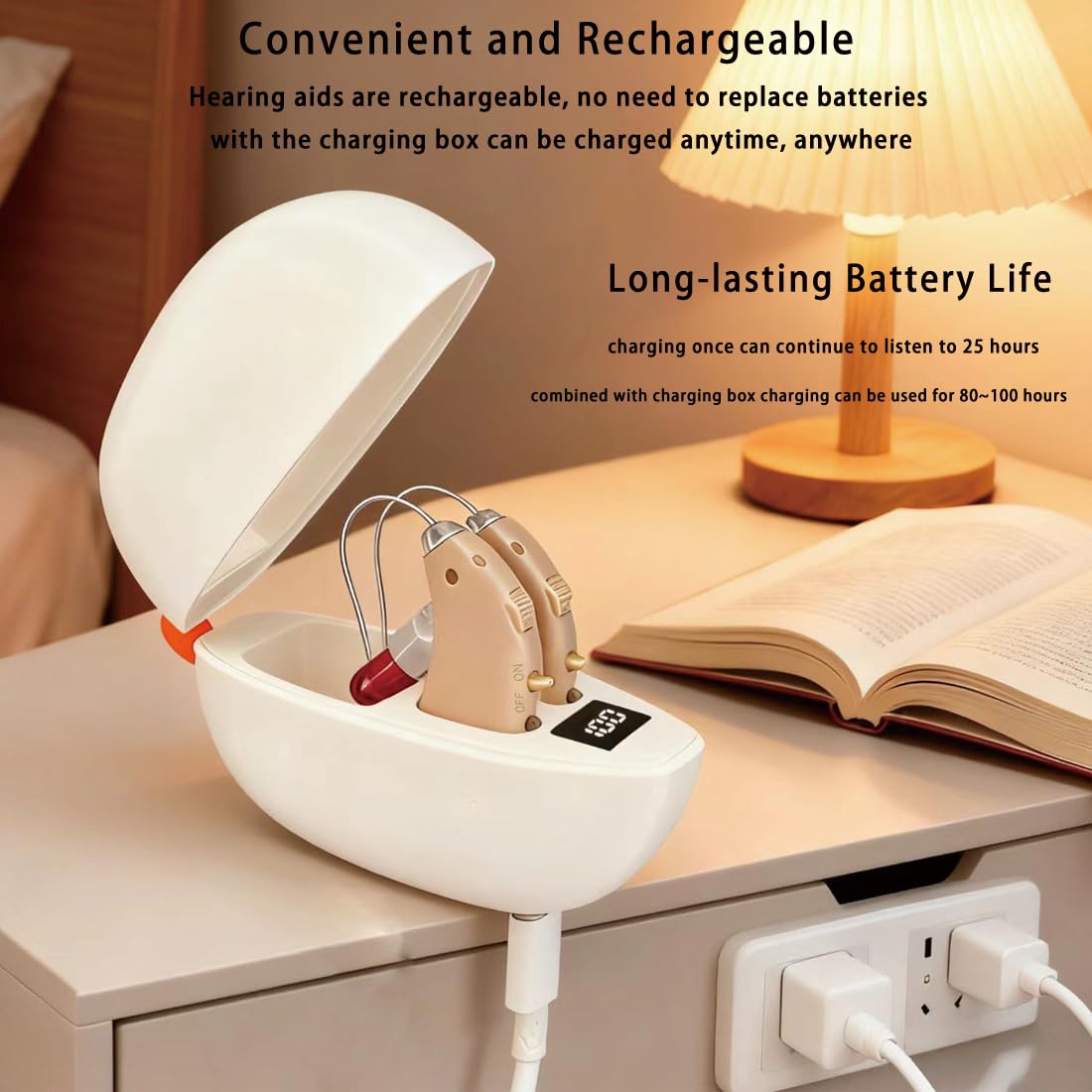 Long Life, Fast Charging:The rechargeable hearing aids have a usb-c fast charging design, a single charge of 2 hours, the charging box can be recycled 5 times, a total of 100 hours of smooth listening, allowing a week of continuous use, without frequent charging. Whether at home or on the go, the long-lasting battery life of the hearing amplifiers provide you with a stable connection and allows you to hear clearly.