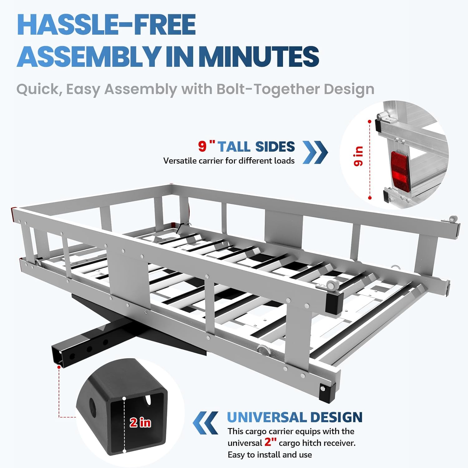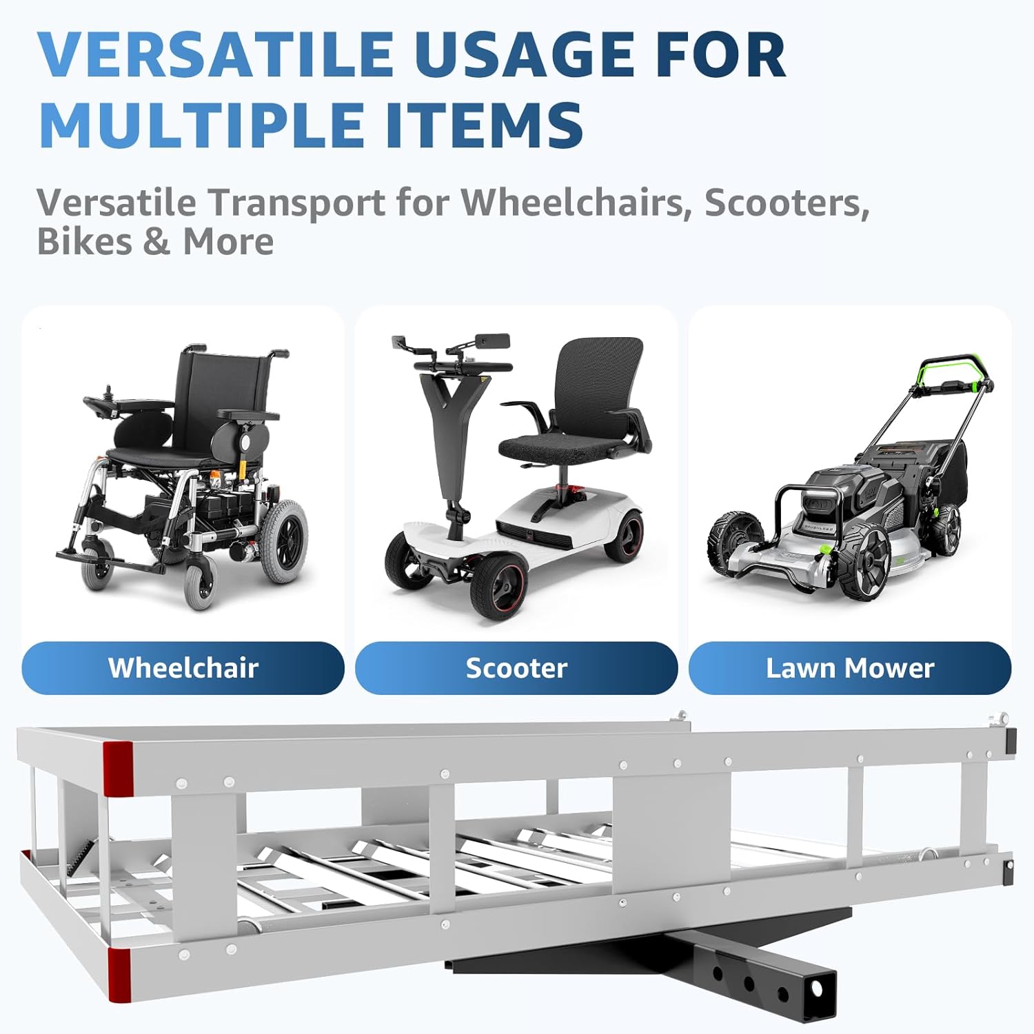 Universal Compatibility: Designed to fit all 2″ x 2″ Class III and IV hitch receivers, this carrier is compatible with trucks, SUVs, RVs, and more, making it easy to transport bulky items.