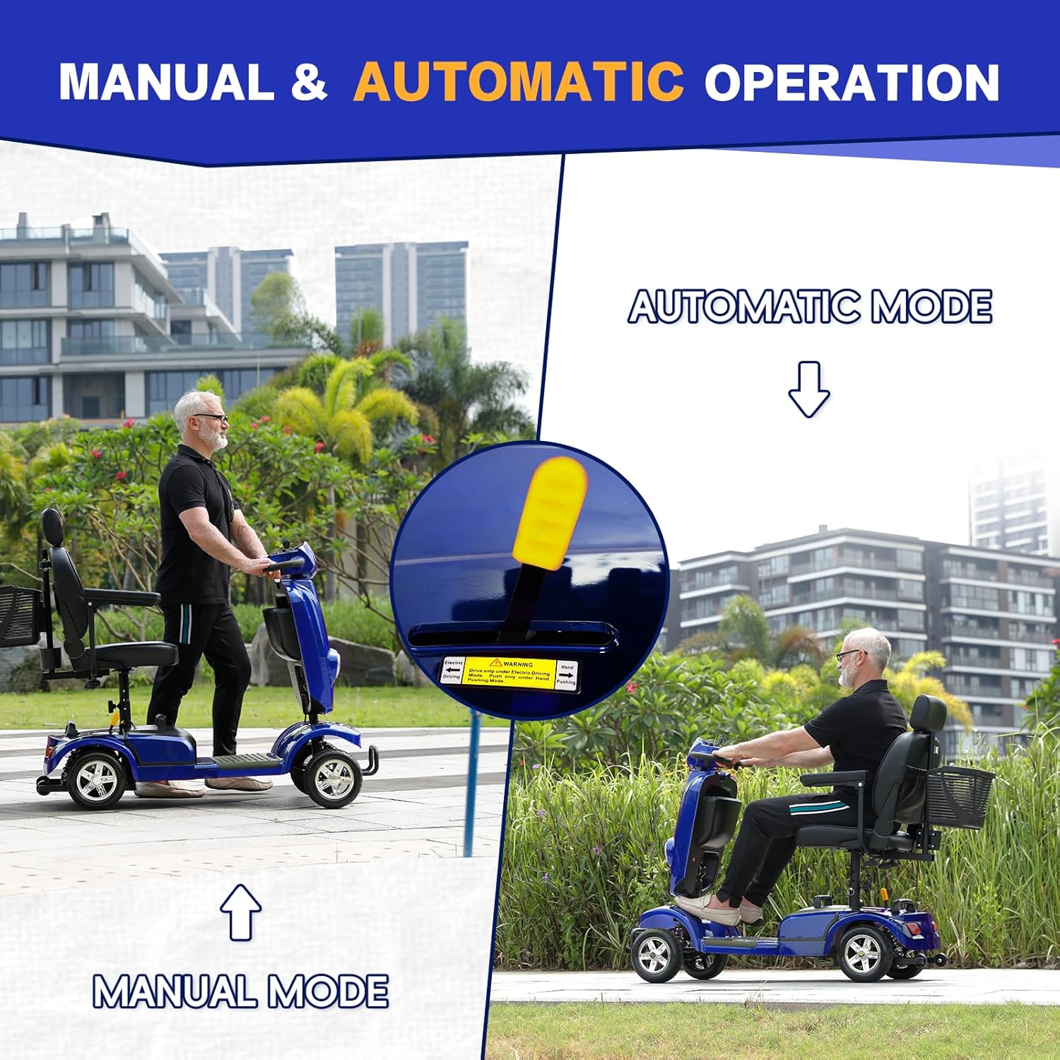 Travel-Friendly, Fully Adjustable Comfort — This mobility scooter for adults features a 360° swivel seat, adjustable tiller and seat height, and flip-up armrests. It disassembles easily to fit into most SUV trunks, making it an excellent travel-friendly powered mobility scooter for commuting, vacations, and errands