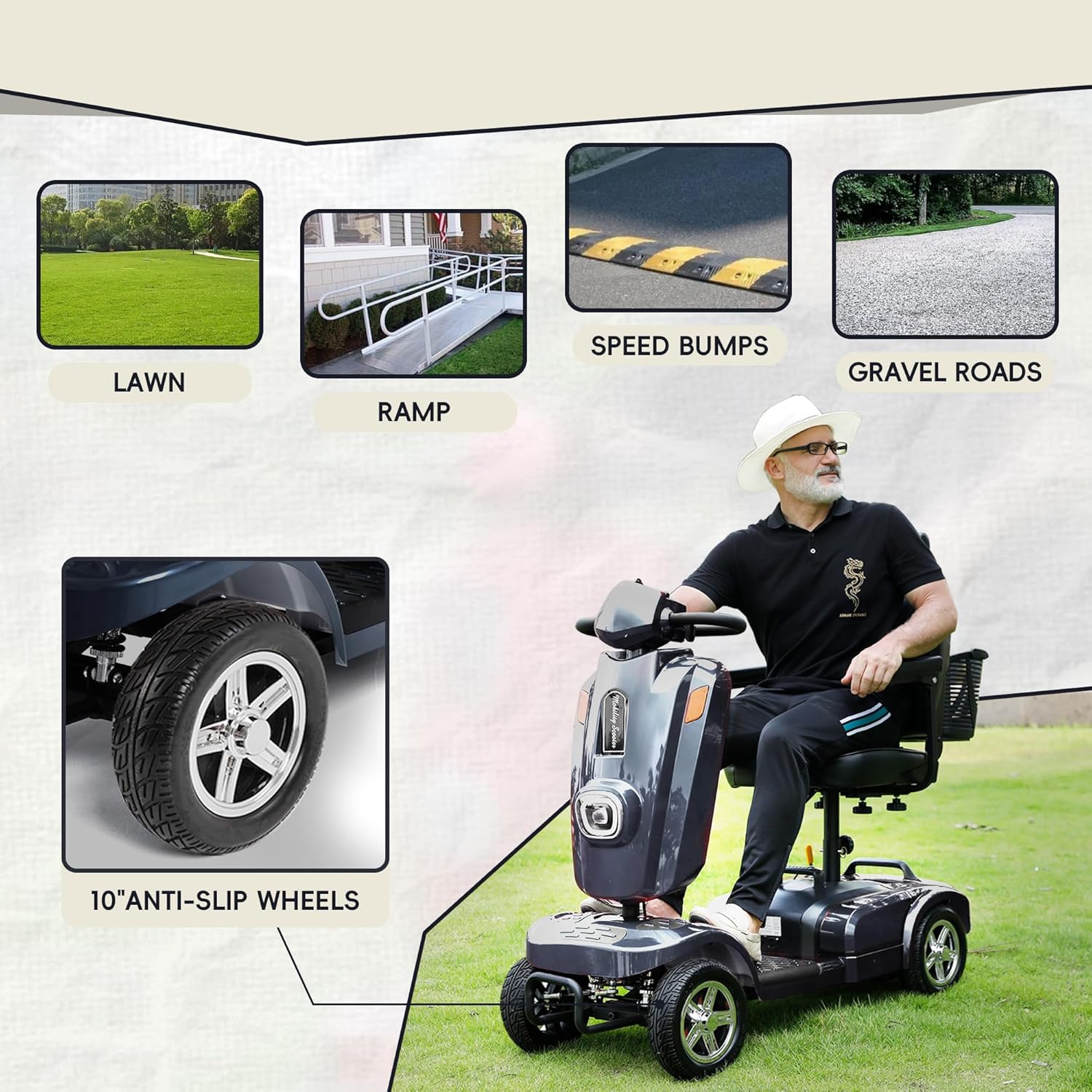 10” Tires & 4” Ground Clearance for All Terrain — Tackle grass, gravel, ramps, and uneven surfaces with ease thanks to 10-inch tires and a 4-inch ground clearance. This versatile design makes the MS09 PLUS one of the most adaptable mobility scooters for seniors and adults who enjoy both neighborhood rides and park adventures