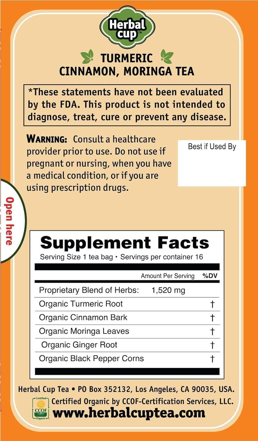 NATURAL INGREDIENTS – Organic Turmeric Root, Organic Cinnamon Bark, Organic Moringa Leaves, Organic Ginger Root, Organic Black Peppercorns