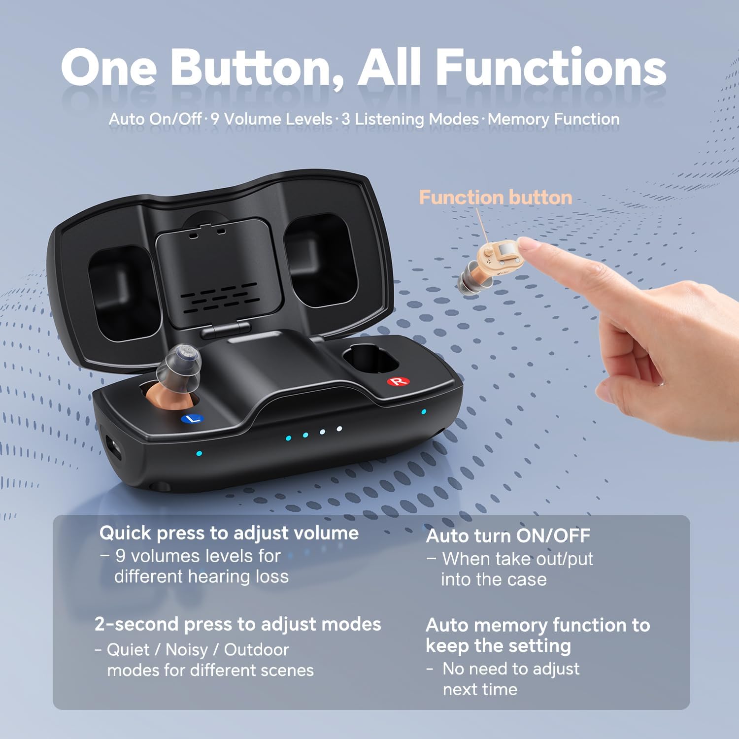 Easy Controls – One button adjusts both volume and mode. Button placement is user-friendly and won’t interfere with pull cord. Choose from 9 volume levels and 3 hearing modes (Quiet, Noisy, and Outdoor), covering mild to severe hearing loss needs.
