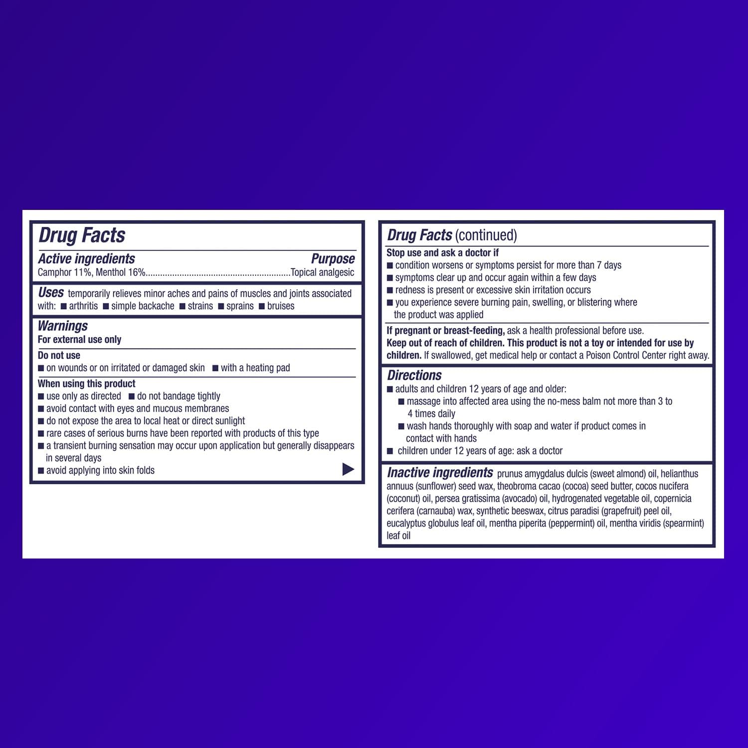 ACTIVE INGREDIENT: Formulated with two maximum-strength pain-relieving ingredients, menthol 16% and camphor 11%, to target multiple pain receptors