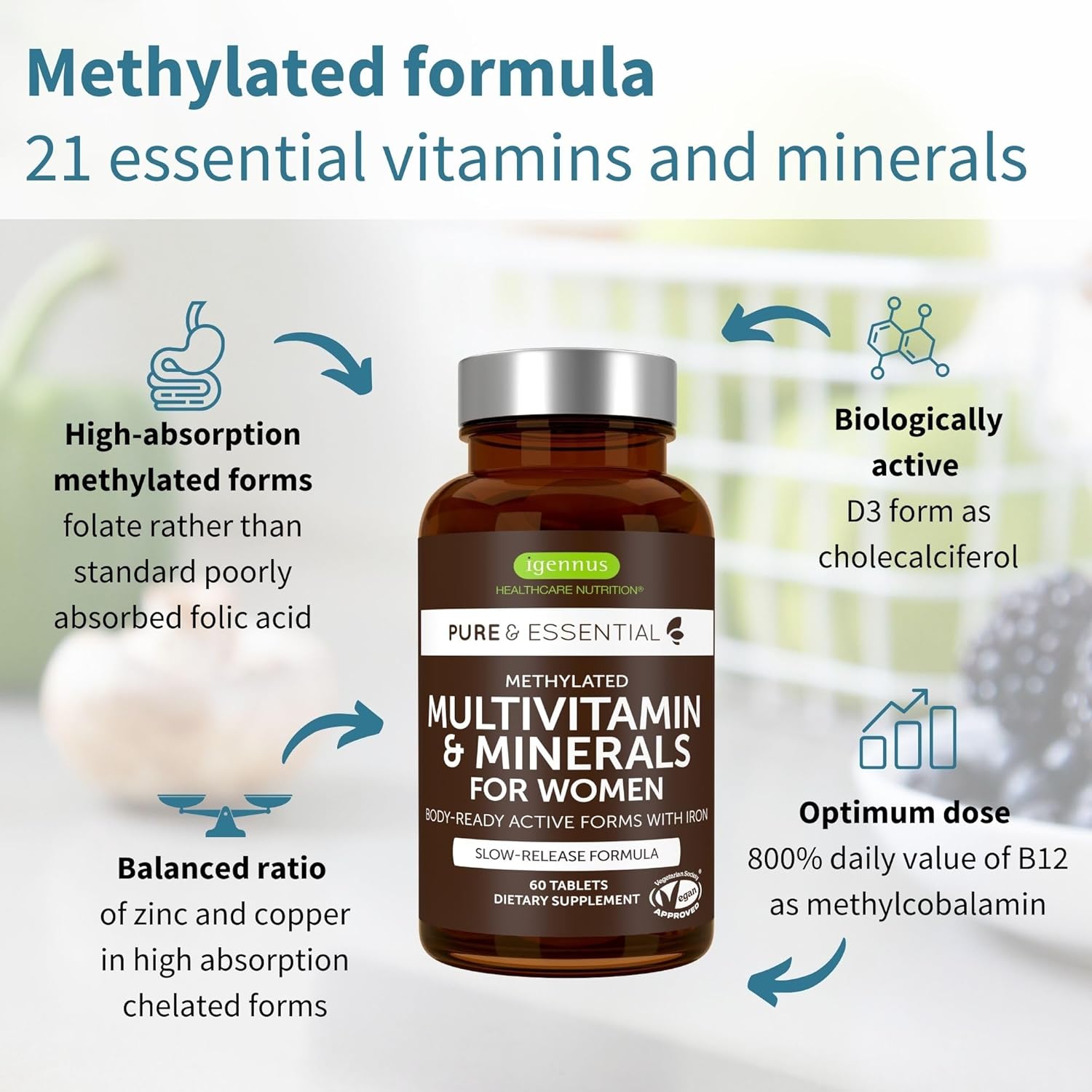 METHYLATED & ACTIVE FORMS each nutrient form has been carefully selected to optimize the journey from supplement to cell. Includes methylated B-vitamins, chelated minerals, gentle iron and zinc (new label, same advanced formula, you may receive either label)*
