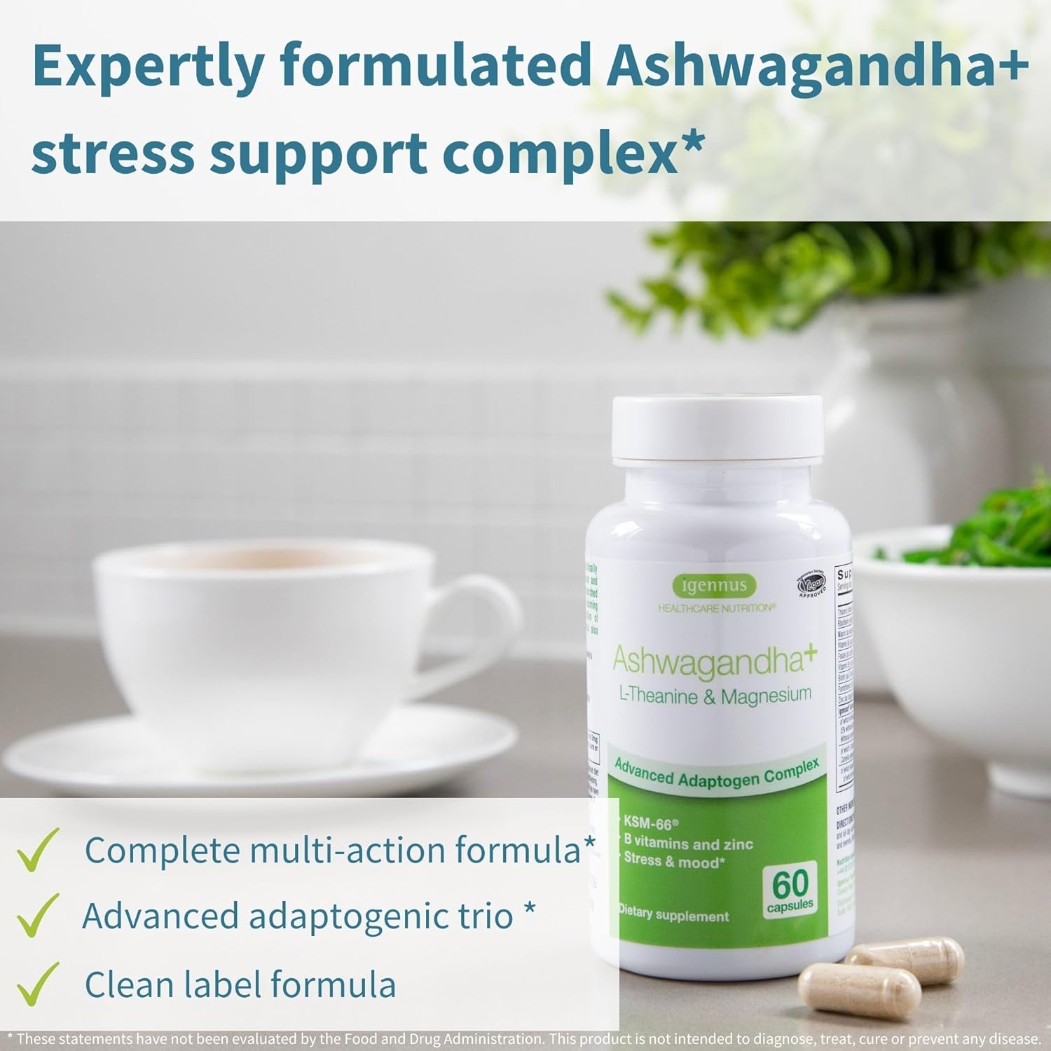 MULTI-ACTION ADAPTOGEN COMPLEX: this advanced formula provides support for times of stress by delivering ashwagandha with L-Theanine, derived from green tea extract, and soluble magnesium from mineral rich seawater*