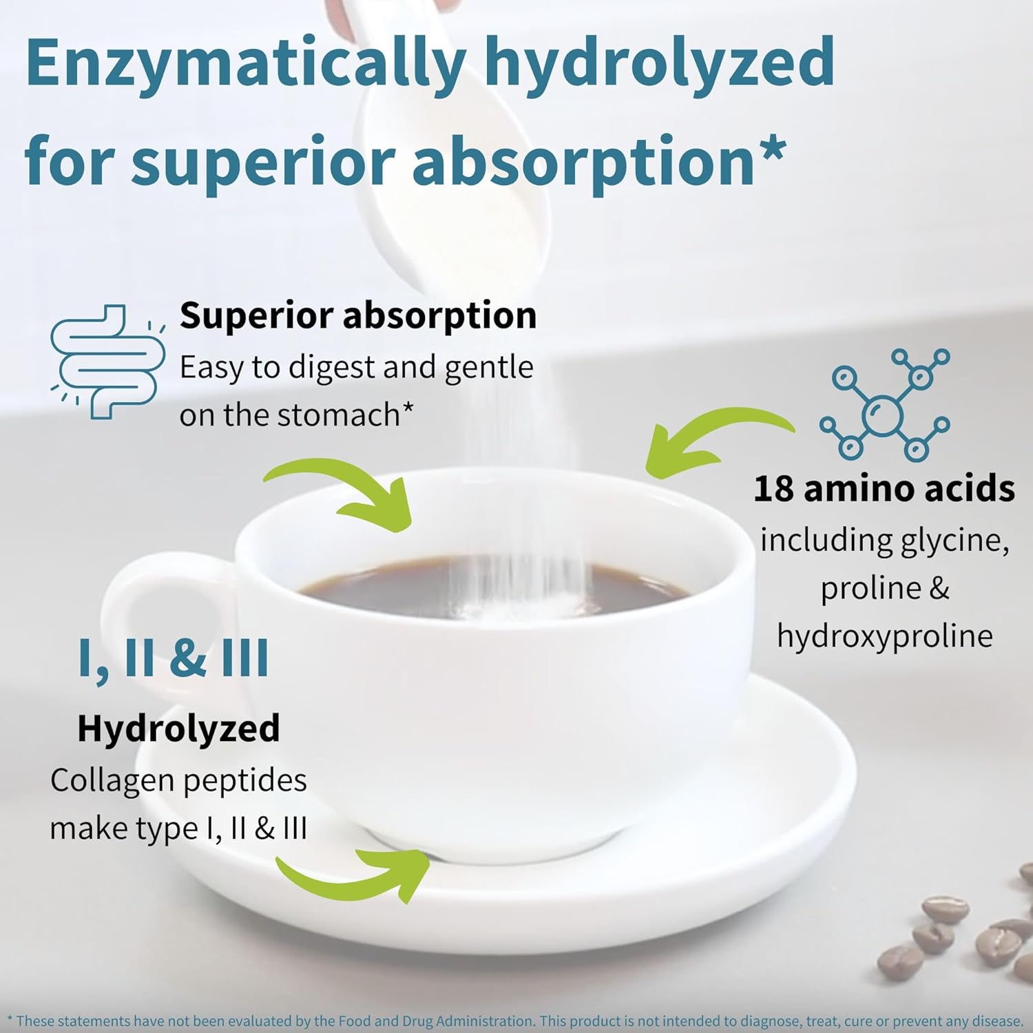 HYDROLYZED PEPTIDES: enzymatically hydrolyzed collagen powder peptides – offers superior bioavailability and is easier to digest. Hydrolysed Collagen peptide proteins can be used by the body to make collagen types 1, 2 & 3 as required