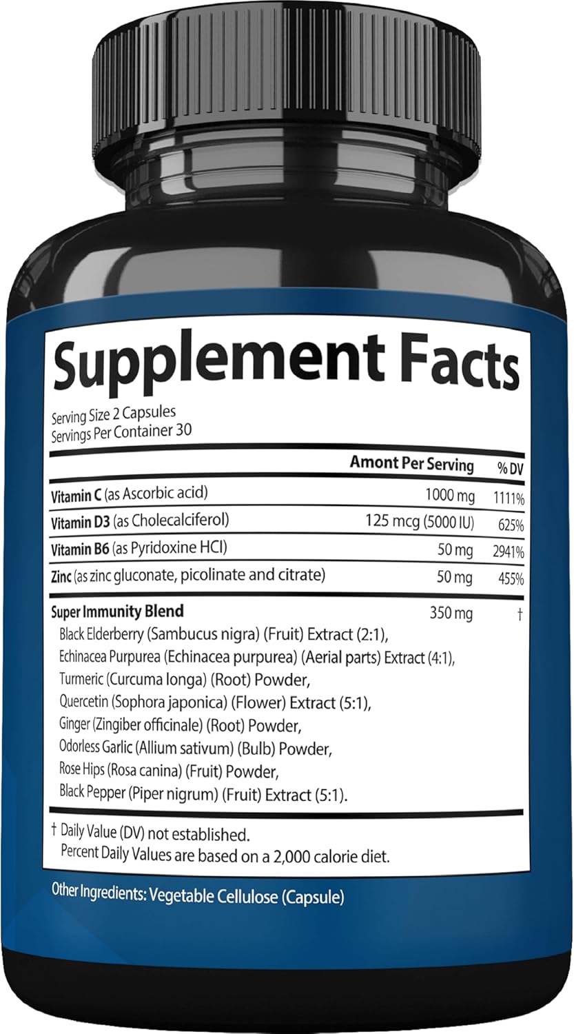 12-in-1 Extra Strength Supplement: A potent complex to boost the immune system, combining the power of Vitamin C with Vitamin D3, Zinc and other 9 potent ingredients in a single, dynamic formula. Designed to support your Immunity and overall health, this advanced blend includes also pure organic Vitamin B6, Echinacea, Elderberry, Turmeric, Ginger, Garlic, Rose Hips, Quercetin, Black Pepper and more.