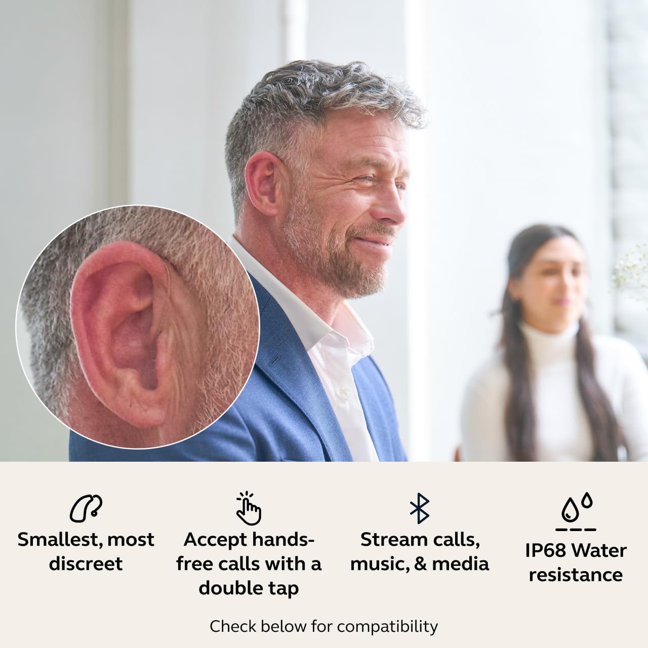 Hands-Free Phone Calls with Tapcontrol (iOS & Android): Take calls just like earbuds and double-tap your ear or hearing aid to answer calls on your compatible Apple or Android device