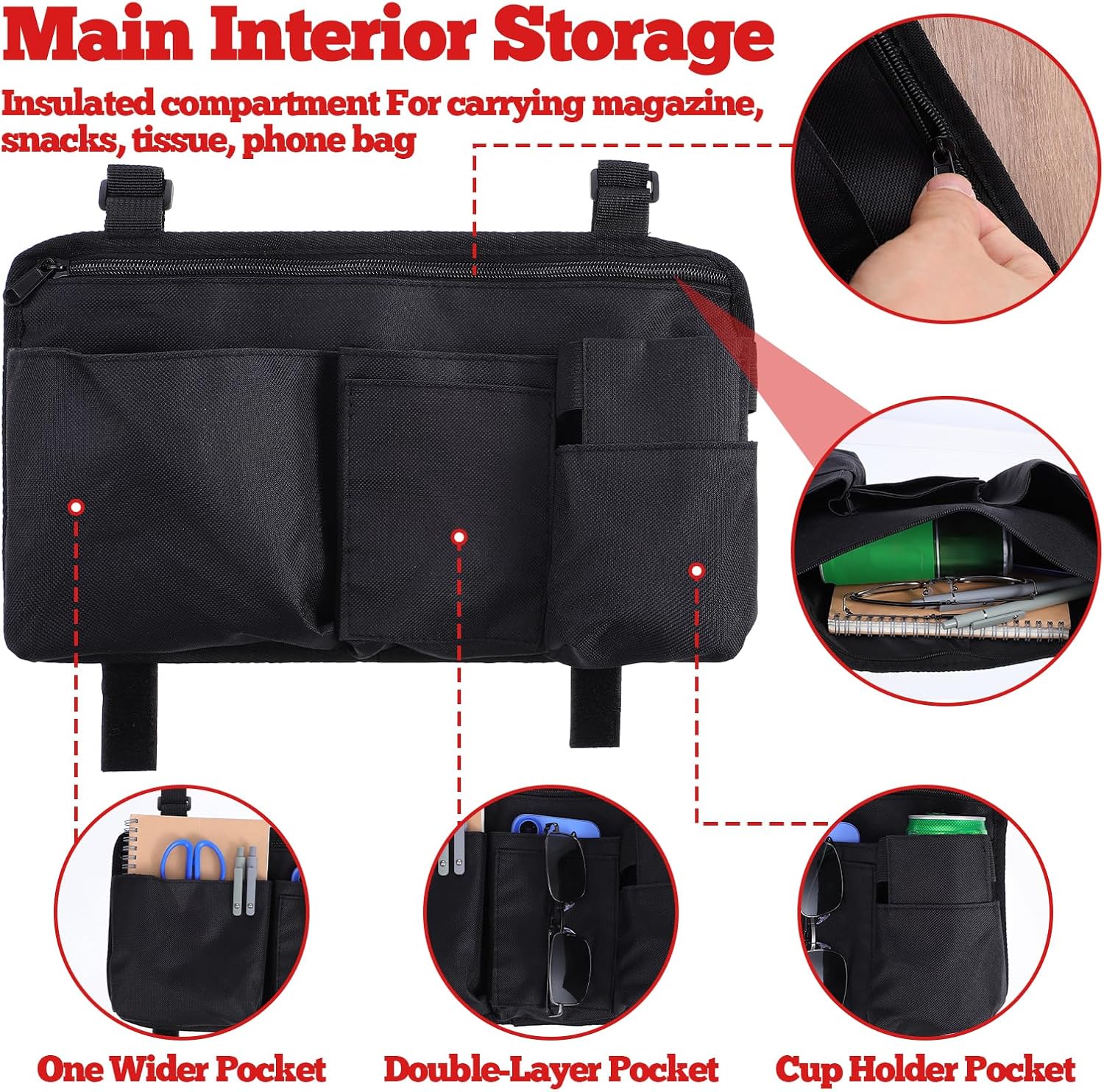 【Versatile Organization】This 36×20cm/14.2×7.9inch wheelchair side bag is engineered to bring order and convenience to daily life. It features a dedicated elasticated cup holder pocket to securely accommodate tumblers of various sizes, a main zippered compartment for larger items, and several front pockets for easy access to a phone, wallet, keys, or medication. This thoughtful layout ensures all essentials have a designated spot, eliminating the need to search for items while on the move.