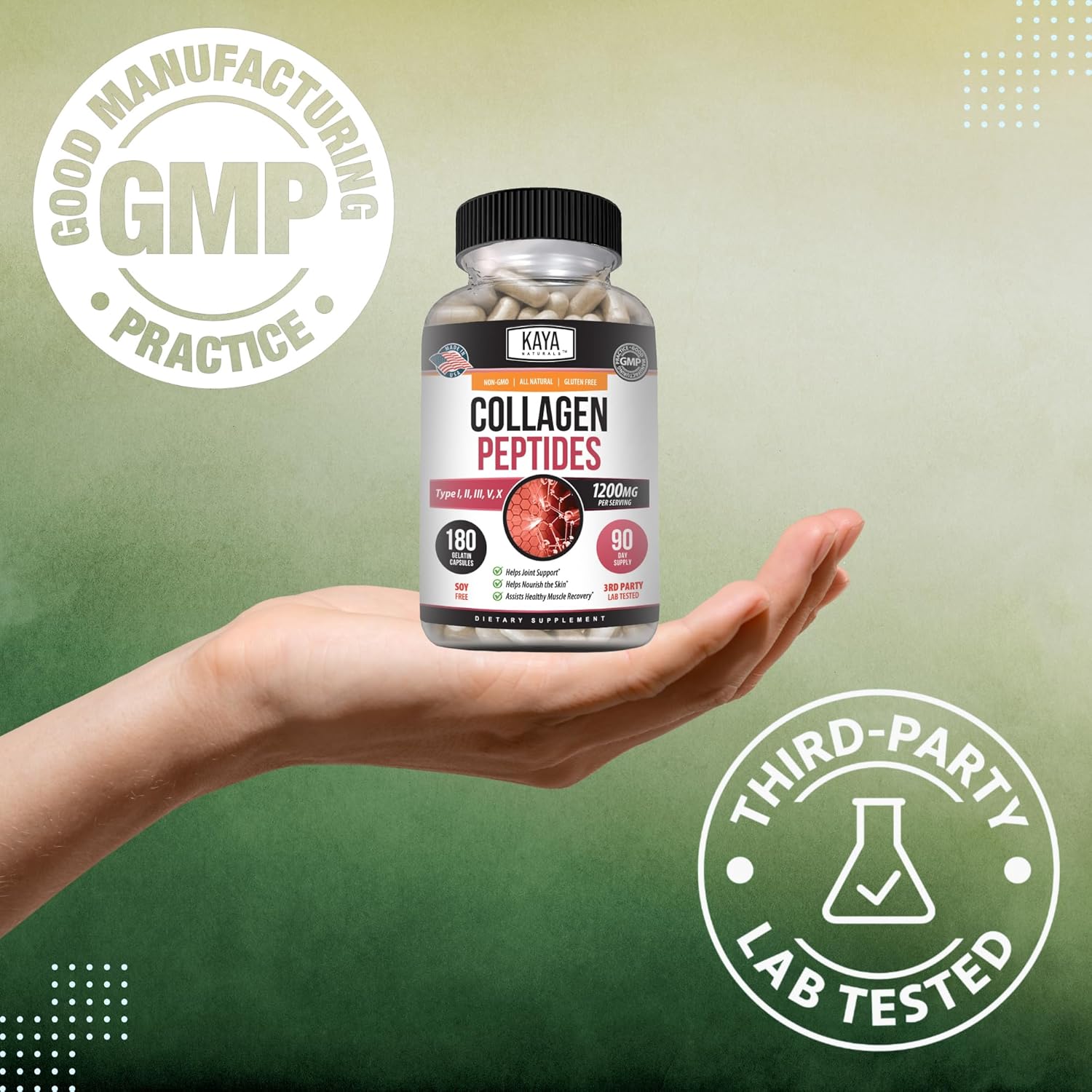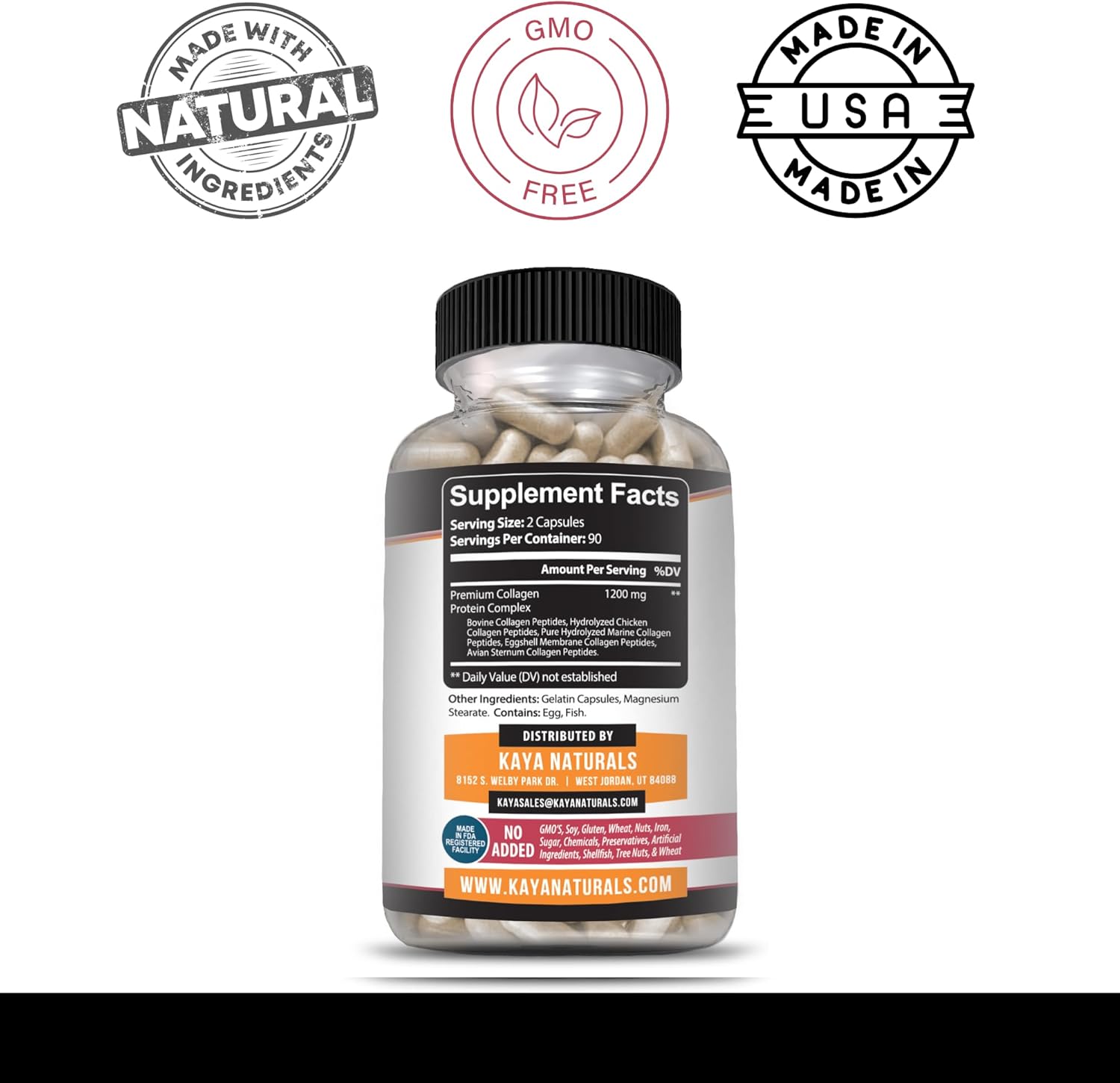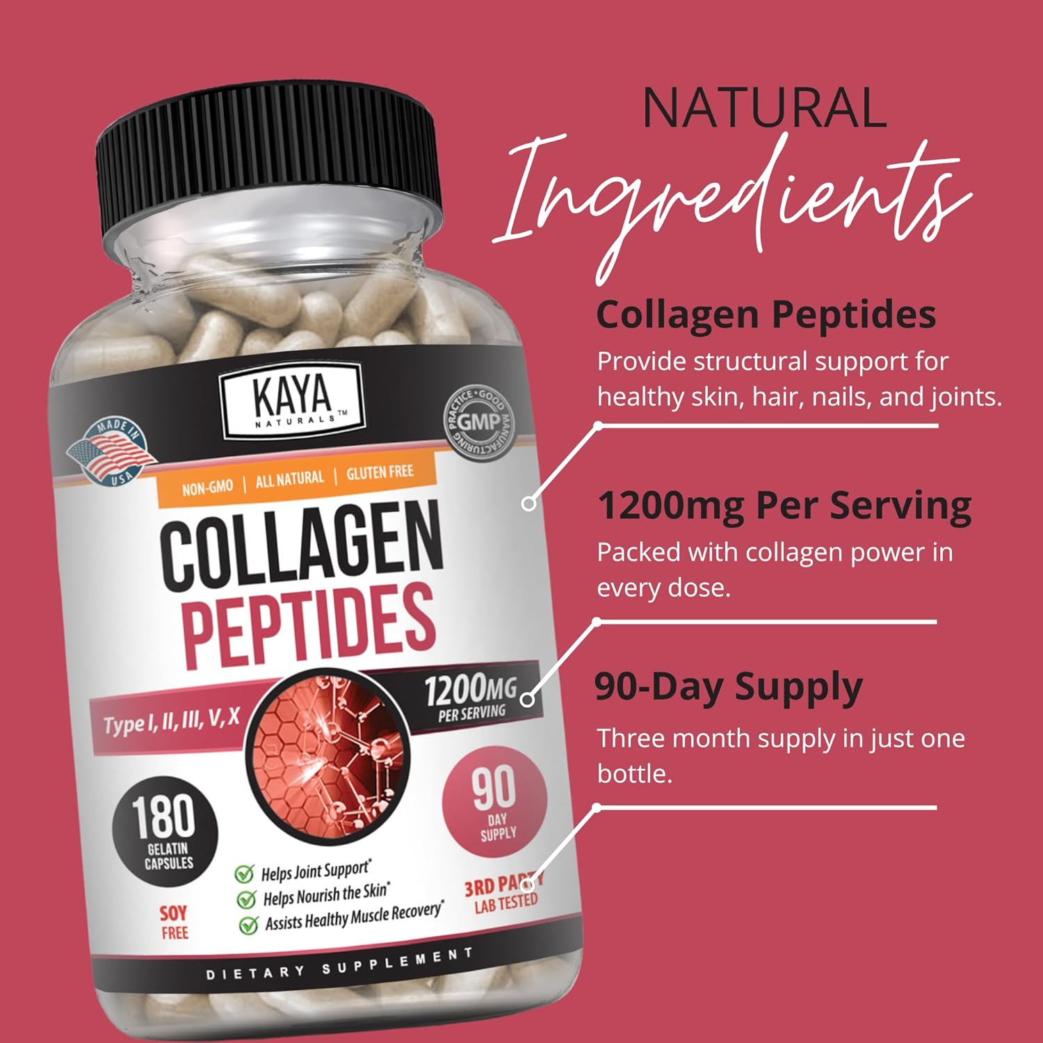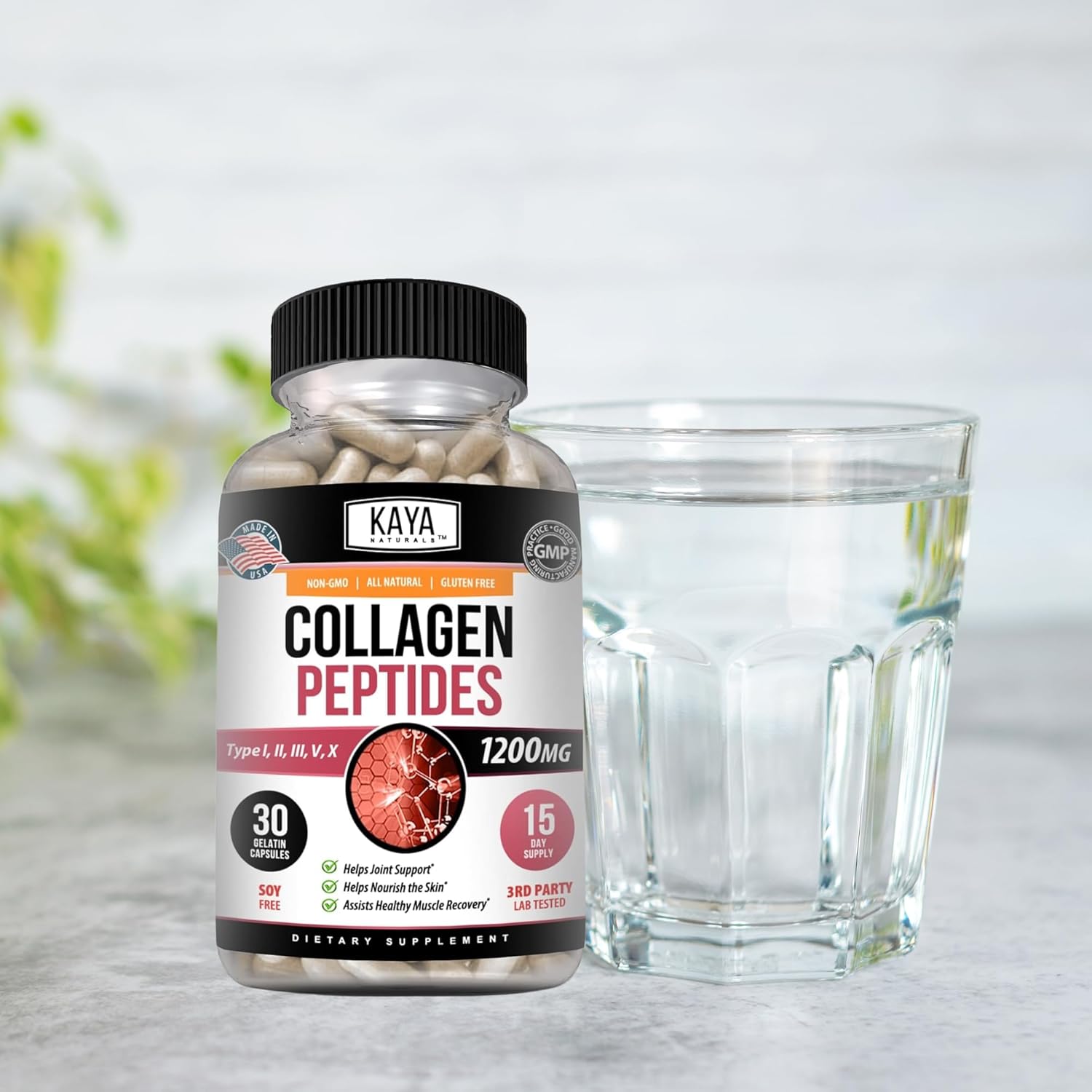 Our all-natural, non-GMO, gluten-free Collagen Peptide supplement is designed to help you look and feel good from the inside out! Collagen is essential to your good health and it is crucial that you get enough collagen to keep yourself looking young on the outside and feeling young on the inside. From supporting joints and healthy lean muscle to promoting plump skin, strong nails and radiant hair. Kaya Naturals’ Collagen Peptide supplement is the easy and convenient way to get your daily dose of collagen. No need to mix up a nasty tasting, gritty collagen drink! With Collagen Peptide capsules you can get your daily dose with no taste or mess. Great for travel and on-the-go! Also you can rest assured that all of our supplements are manufactured in the United States and third party tested for your peace of mind.
