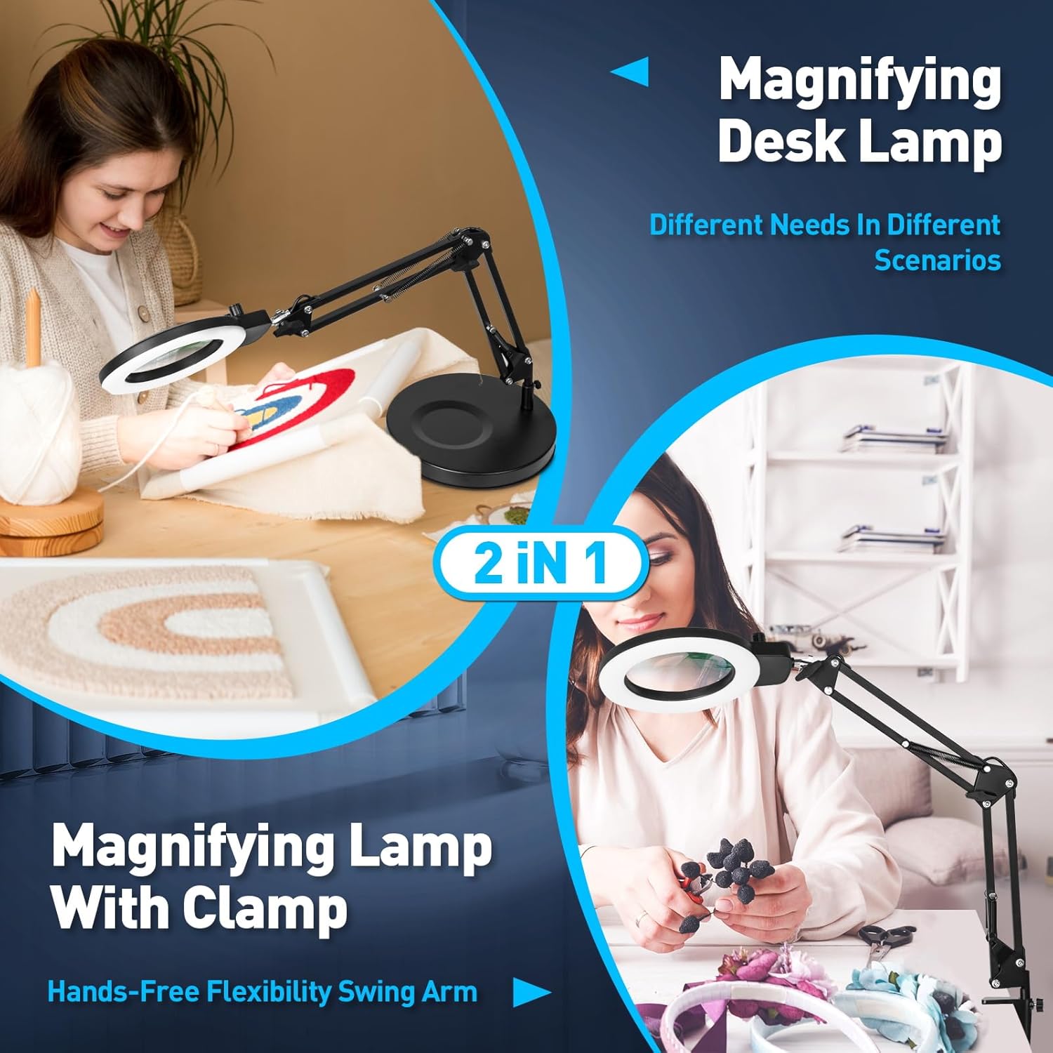 2-in-1 Magnifying Desk Lamp & Clamp Light: The size of the base is increased to 9 inches, and it will not fall down no matter you stretch the magnifying glass light to any angle. In addition, the heavy metal clip can be clamped at the edge of the table with a max of 2.1 inches, The upper and lower sides of the clip are equipped with foam pads, which completely prevent your table from being scratched and increase the stability of the clip. Choose the right way to use your magnifying desk & clamp lamp at will.