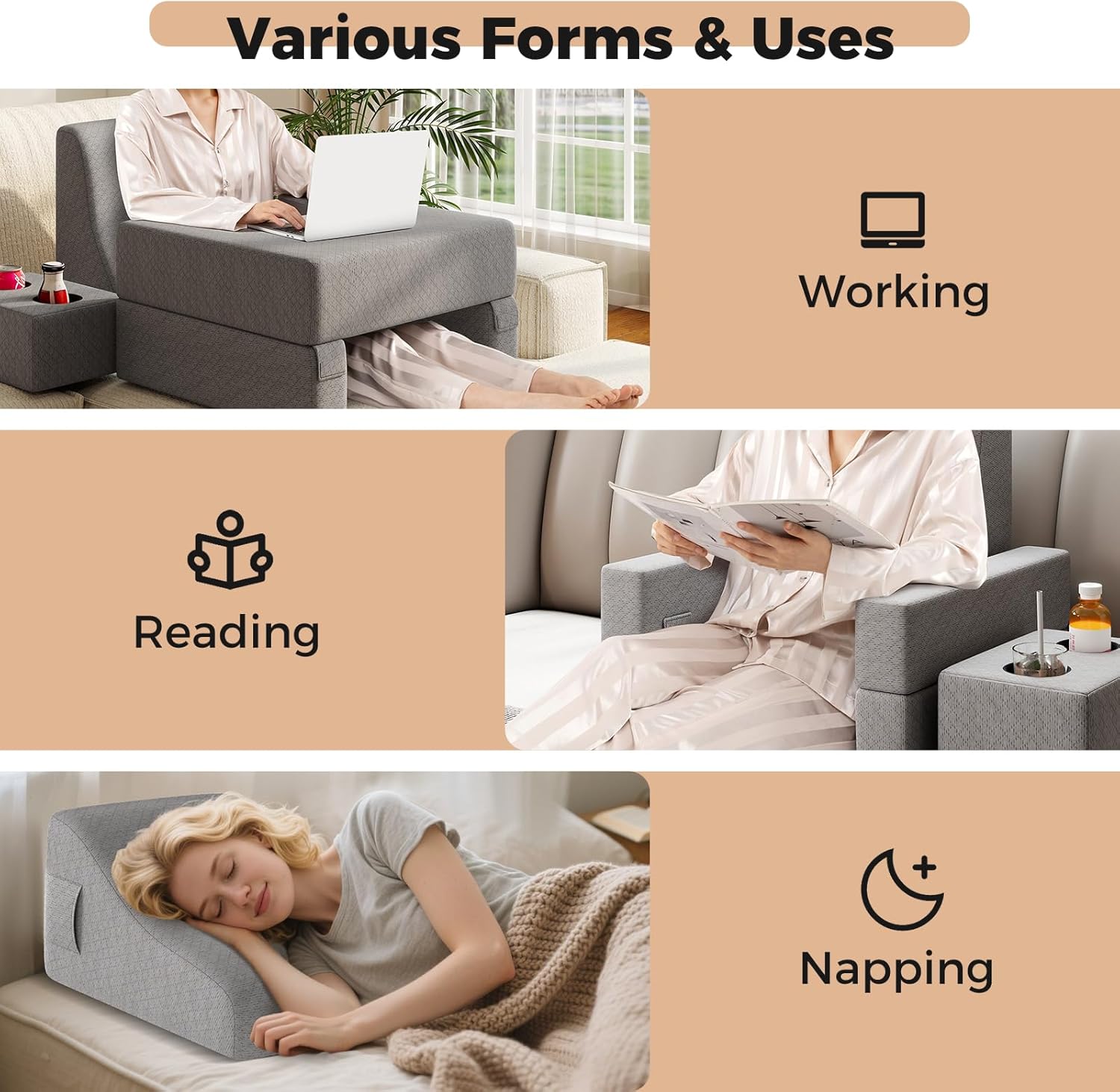 Various Forms & Uses: The set includes 3 pieces that can be used together or separately, offering flexibility in setup. With dual-angle backrest options, it provides optimal comfort whether you’re sitting up or lying down.