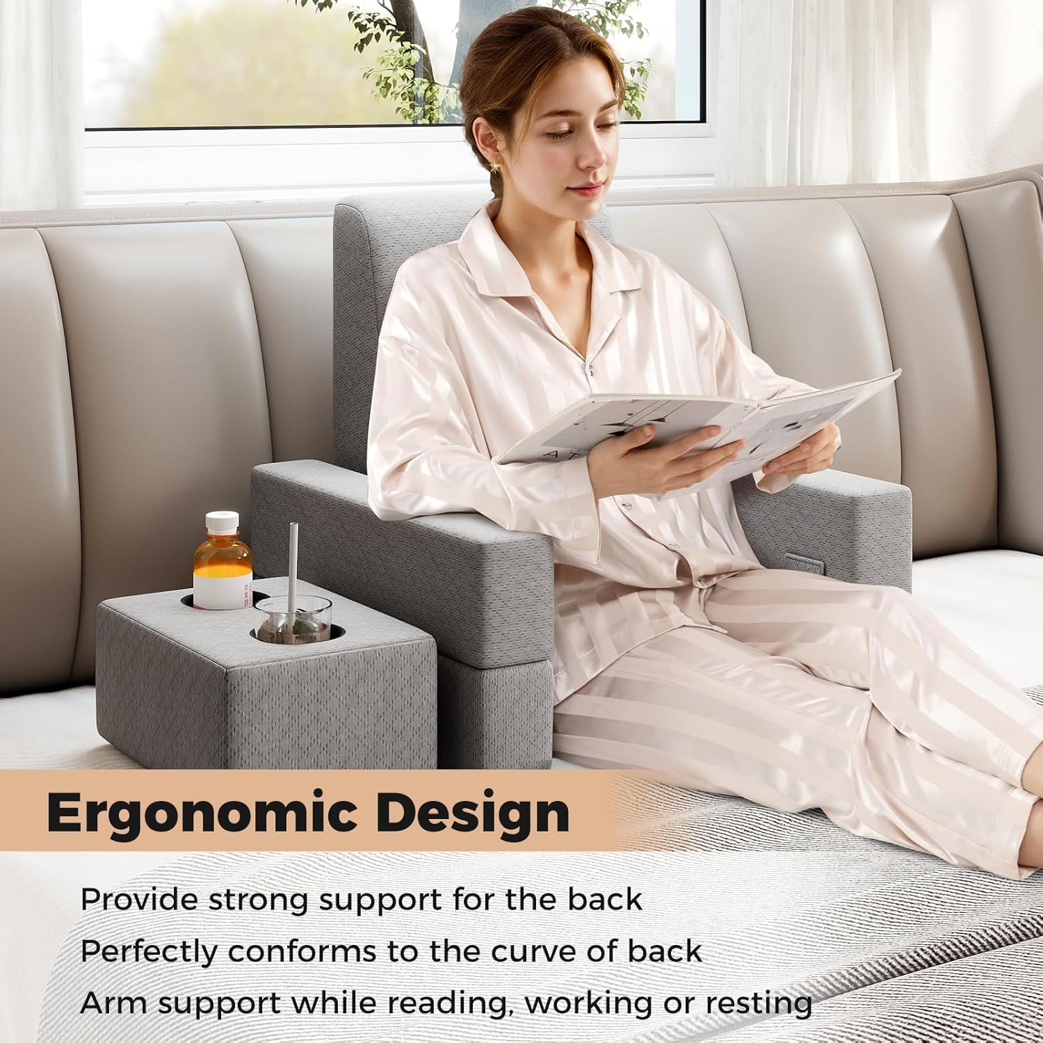 Elevate your comfort and productivity with our 3-piece reading pillow set, meticulously designed to provide strong support for your back and perfectly conform to its curve. This set features a machine-washable cover for easy care, high-density foam that maintains its shape, and arm supports while reading, working, or resting for added comfort. With smart storage solutions including a wide tabletop for your laptop, pockets for your mobile devices, and dual cup holders, this pillow set combines functionality with comfort, making it an essential addition to your home or office space.